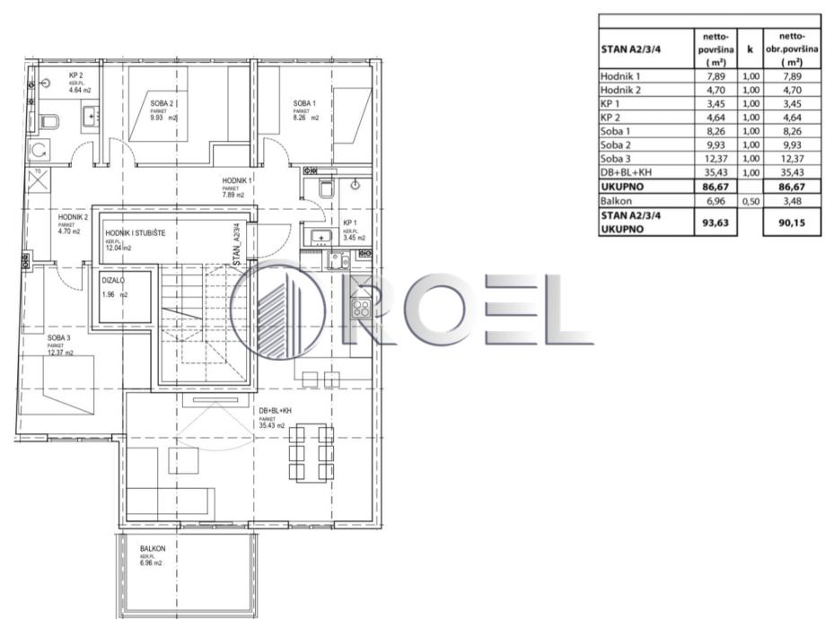 Stan se sastoji od ulaznog hodnika 1 (7,89 m2), hodnika 2 (4,70 m2), kupaone 1 (3,45 m2), kupaone 2 (4,64 m2), sobe 1 (8,26 m2), sobe 2 (9,93 m2), sobe 3 (12,37 m2), dnevnog boravaka, kuhinje i blagovaone (35,43m2), balkona (6,96 m2), spremišta (2- 4 m2 po izboru), te pripadajućeg parkirnog mjesta površine 12,50 m2.