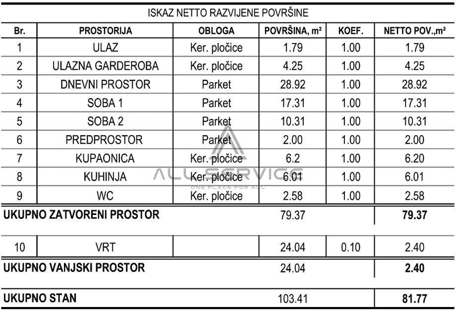 Ukupna površina stana iznosi 103,41 m², dok neto korisna površina (NKP) iznosi 81,77 m².