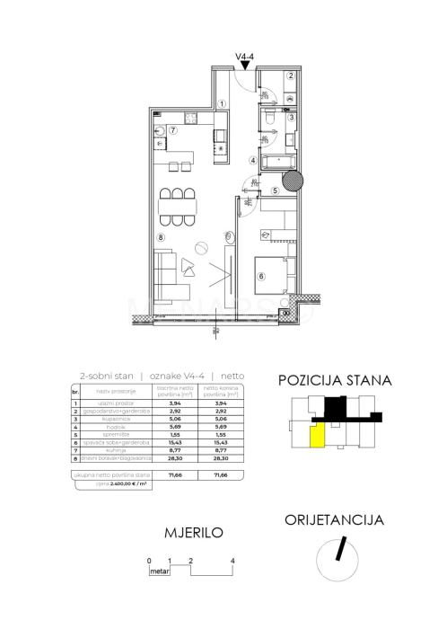 Prodaje se 2-sob stan/apartman na 4. katu, oznake V4-4, površine 71,66 m2, koji se sastoji od ulaznog prostora, spremišta, kupaonice, hodnika, gospodarstva+garderobe, spavaće sobe s garderobom, kuhinje i dnevnog boravka sa blagovaonom.