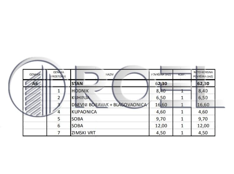 Navedeni stan nalazi se na drugom katu. Površine je 62,30 m2 i sastoji se od hodnika, kuhinje s blagovaonom, kupaonice, dvije spavaće sobe i zimskog vrta površine 4,50 m2.
