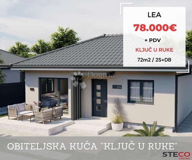 Kuća “Lea” - izuzetno funkcionalna dvosobna kuća od nešto više od 72m2 bruto površine po sistemu “Ključ u ruke”, i to za samo 97.500,- eura sa uključenim PDV-om na temeljima kupca.