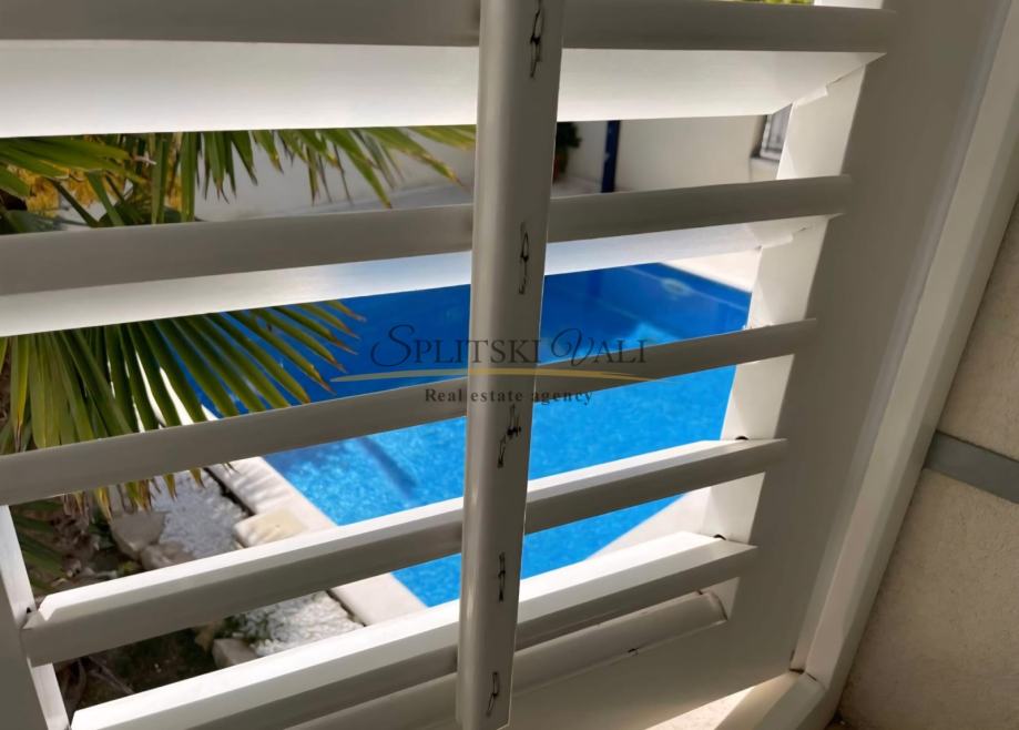 Prodaje se stan na prvom katu, netto površine 100 m2, kompletno luksuzno uređen, trenutno u funkciji tri sobe s tri kupaonice, ali sa pripremljenim tlocrtom za veliki komforan stan. Orijentacije jugo-istok s obiljem sunca. Stanu pripada bazen i dio vrta ukupne površine 70 m2, s mogućnošću korištenja parkirnog mjesta do etažiranja.