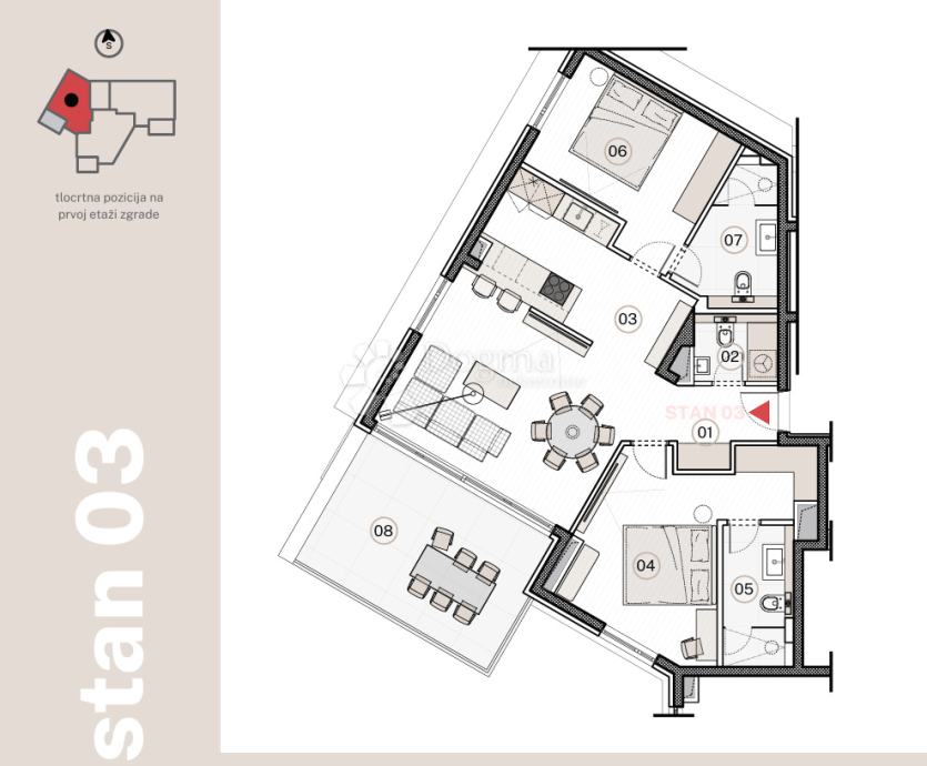 Stan je južno orijentiran, čime se maksimalno koristi dnevno osvjetljenje te se ostvaruje ugodan i otvoren pogled prema moru. Sastoji se od dvije spavaće sobe, dvije kupaonice, WC te prostrane terase koja čini skladnu cjelinu s dnevnim boravkom.