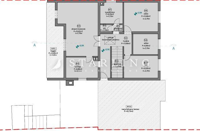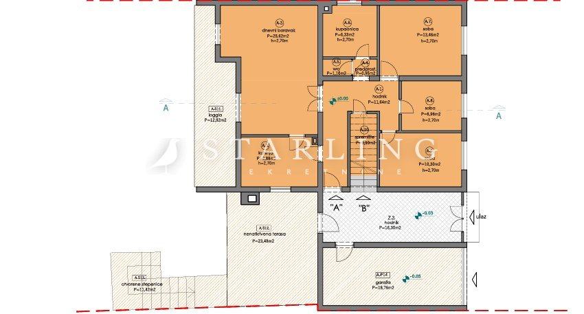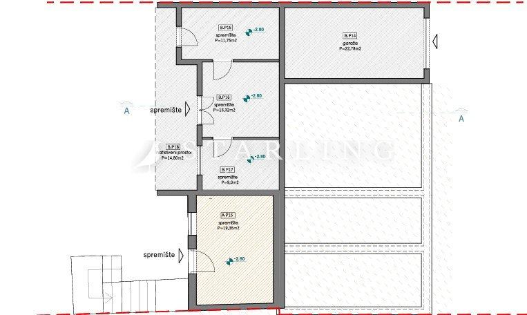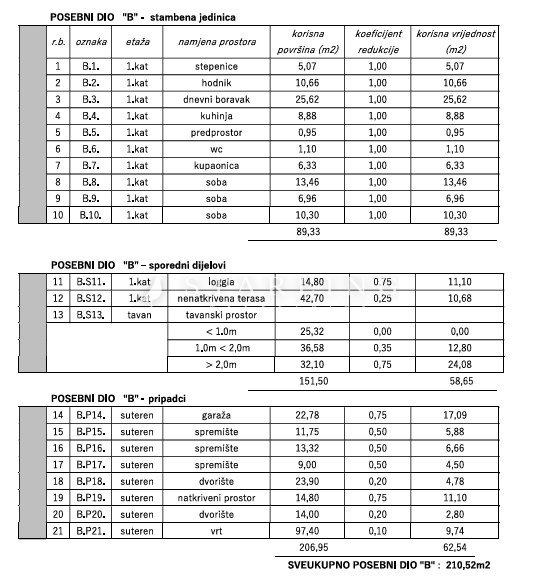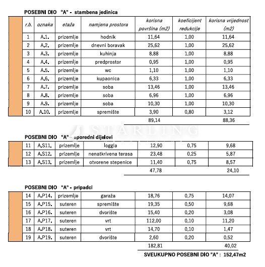 Uz to, kuća raspolaže s dvije garaže, konobom i vrtom od cca 300 m² i manjim stanom od 37 m2 orijentiran prema moru. Postoji mogućnost nadogradnje dodatnog kata. Nekretnina je za adaptaciju, što budućem vlasniku ostavlja slobodu uređenja prema vlastitim željama.