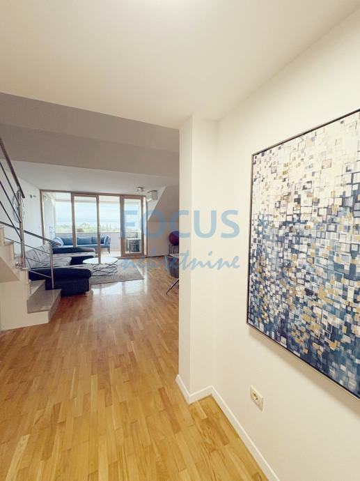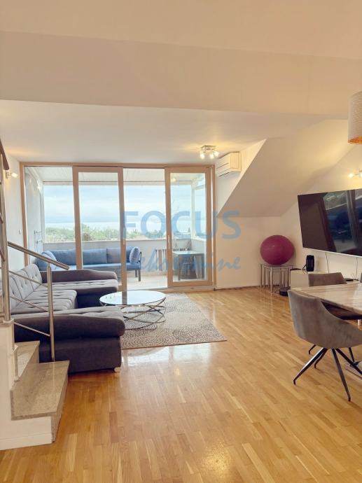Prodajemo stan površine 105m2 na trećem katu manje zgrade bez lifta. Stan se sastoji od ulaza, predsoblja, dnevnog dijela, kuhinje sa blagavaonom, dvije spavaće sobe, kupaonice, loggie sa otvorenim pogledom na more.Na galeriji površine 25m2 smještena je kupaonica i spavaća soba. Sve prostorije u stanu su novouređene i opremljene visokokvalitetnim namještajem po mjeri. U cijeni stana je box garaža u prizemlju površine 20m2. Vlasništvo uredno.