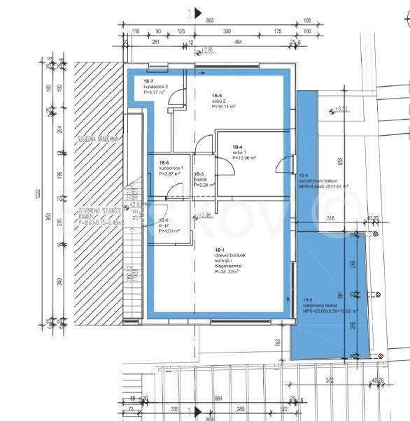 Dvosoban stan stambene površine 75,27 m2 + terasa 67,01 m2 + vrt 49,65 m2, 1.kat stambene zgrade.