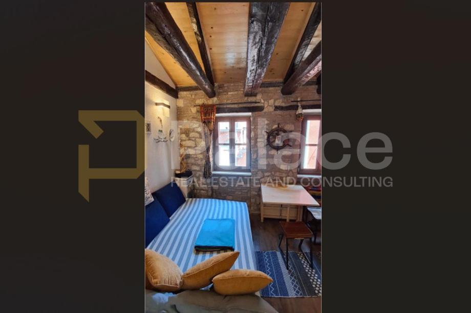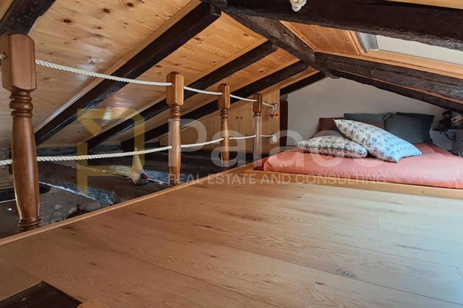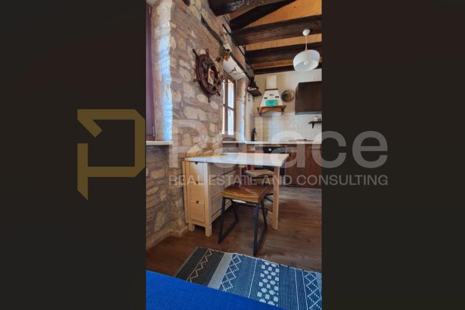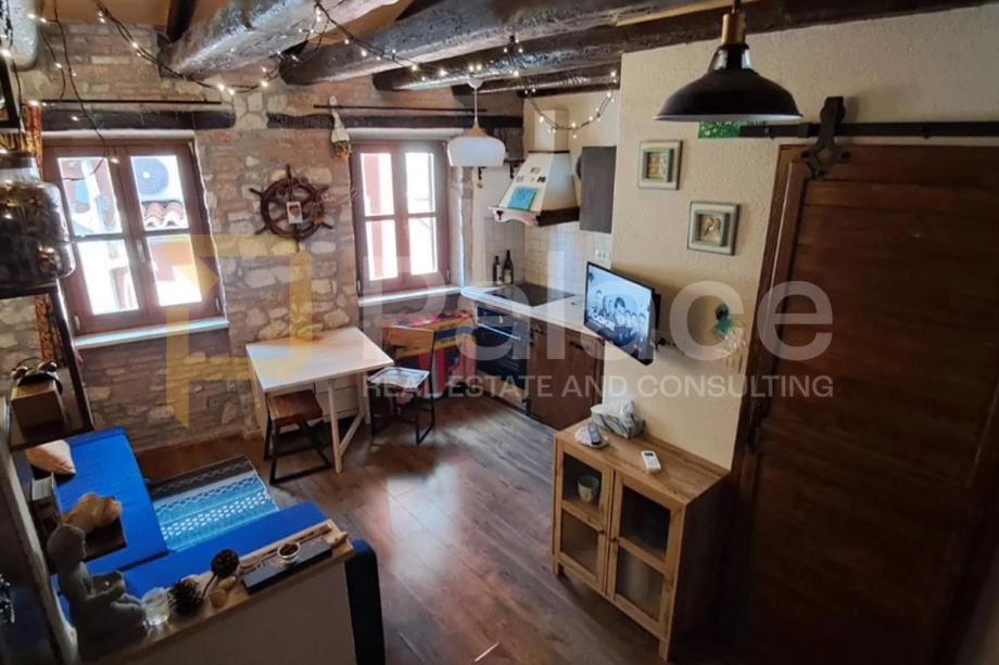 Ova nekretnina od 25 m², smještena na trećem (posljednjem) katu tradicionalne kamene zgrade, odiše toplinom i autentičnošću. Stan je pažljivo renoviran, s naglaskom na očuvanju izvornih detalja poput izloženih drvenih greda, te nudi ugodan galerijski prostor za opuštanje. Poseban naglasak daje unikatni stol izrađen od istarskog kamena – simbol lokalne tradicije i obrta.