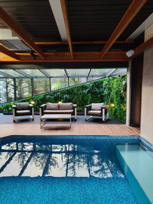 Bazen je opremljen sa svom potrebnom tehnikom za filtriranje vode, zaštitnim tvrdim pokrovom protiv utapanja te dodatno vodenim topom za uzvodno plivanje te efektnim slapom za savršenu zvučnu kulisu. Prostor bazena i welnessa opremljen je ozvučenjem.