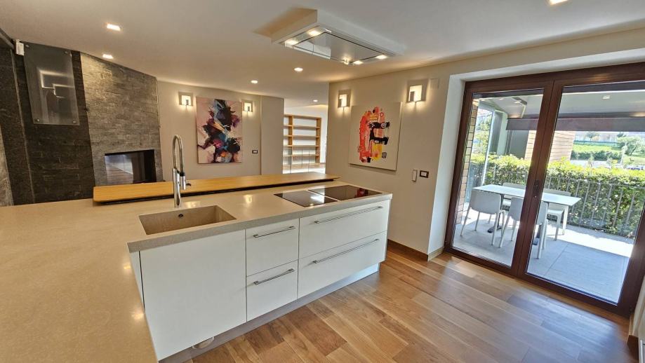 Efektnim i prostranim stubištem se iz suterena pristupa prizemlju koje je definirano kao dnevni prostor sačinjen od velikog open space prostora s dnevnim boravkomi blagovaonicom i kutom za biblioteku te malo zavučenom prostranom kuhinjom s poluotokom kao pultom za brze obroke. Iz kuhinje i blagovaonice se može pristupiti vanjskoj terasi zelenilom zaštićenoj od pogleda, a i sunca izvlačnom tendom na daljinsko upravljanje. Iz prostora kuhinje se također kroz "skrivena" motorizirana vrata putem prekidača pristupa velikoj prostoriji za tehniku koja je ujedno i vešeraj.