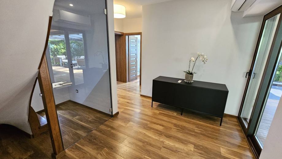 Na 1. katu se nalazi spavaći dio s ulaznim predprostorom (degažmanom), tri spavaće sobe s zajedničkom kupaonicom od koji je jedna trenutno opremljena kao walk-in garderoba. Na istoj etaži se nalazi prostor s bazenom, wellness prostorijom opremljenom saunom i masažnim stolom te zatvorenog prostora za sjedenje pored bazena i velike vanjske terase natkrivene bio pergolom na daljinsko upravljanje s efektnom led rasvjetom.