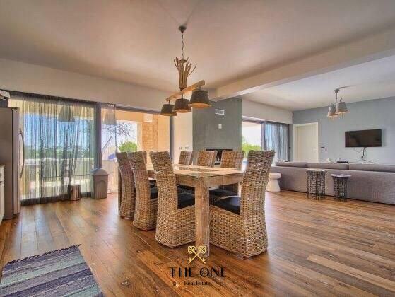 U prizemlju se iz ulaznog hodnika ulazi u dnevni dio vile koji se sastoji od moderne kuhinje s blagovaonom i dnevnog boravka s kaminom koji je povezan s natkrivenom terasom putem velikih staklenih stijena. Na prostranoj terasi se nalazi veliki bazen sa sunčalištem, jacuzzi te nekoliko lounge predjela.