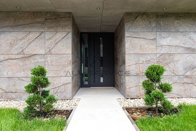 Custom made stepenice i blagovaonski stol, predivni lusteri, custom made sauna i hot tube u wellness prostoriji, Schuco fiksna i kupaonska stolarija, klizne stijene proizvođača Otima minimal frame, kožna garnitura Natuzzi, kuhinja Dan Kuchen i kotlovnica 80% izrađena u bakru i gotovo 100% izolirana garancija su kvalitete ugrađenih materijala.