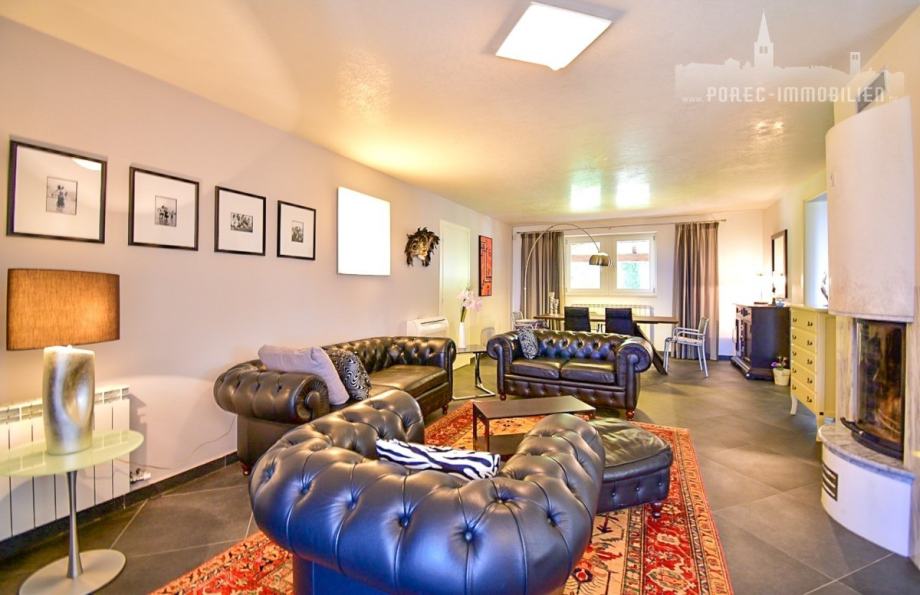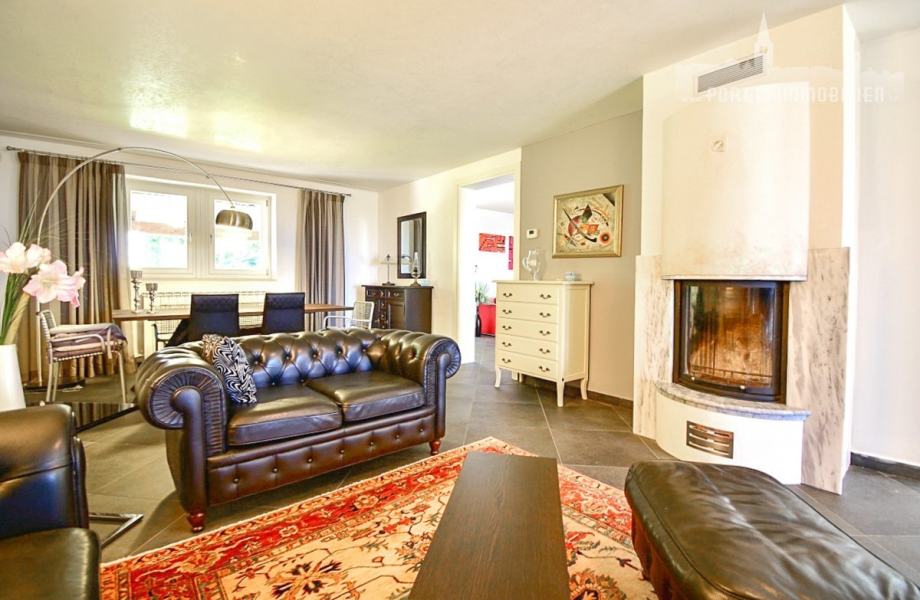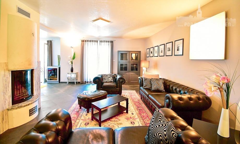 U prizemlju kuće se nalazi prostrani ulazni hol, potpuno opremljena kuhinja sa otokom, dnevna soba sa kaminom, spavaća soba sa kuponicom i izlazom na terasu, manji toalet i velika garderoba.
