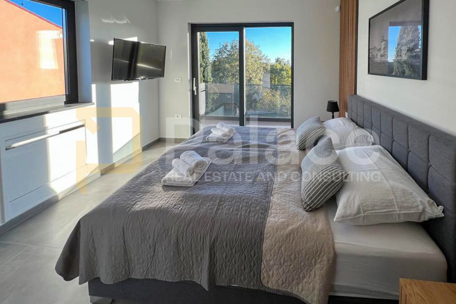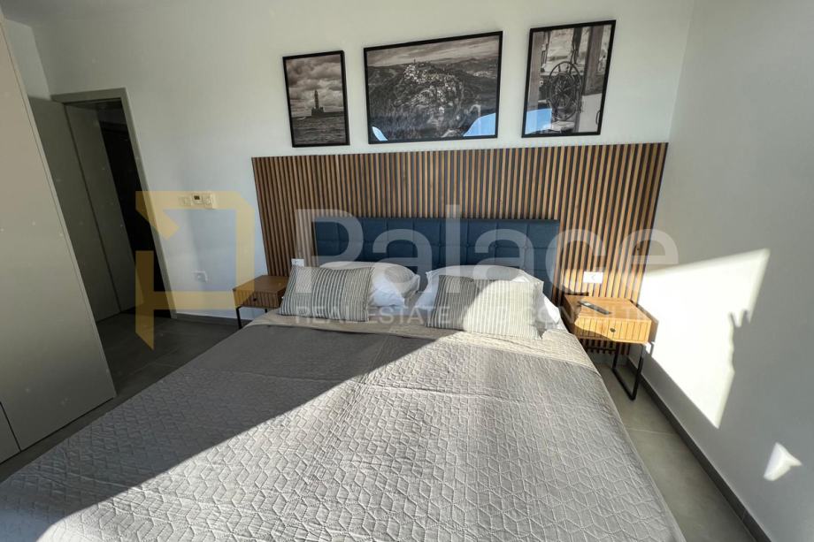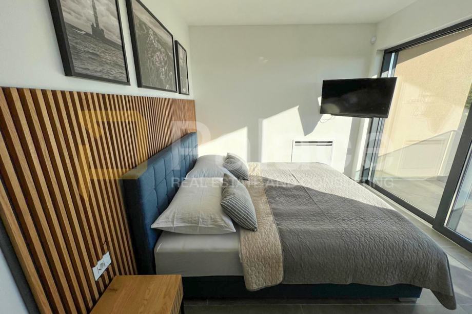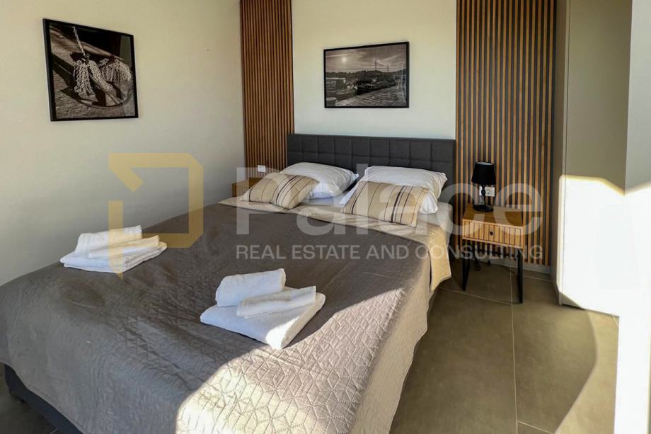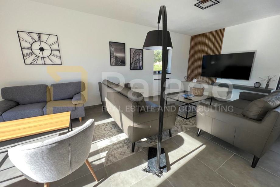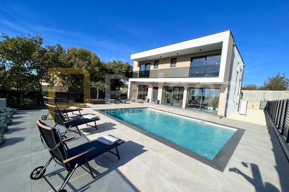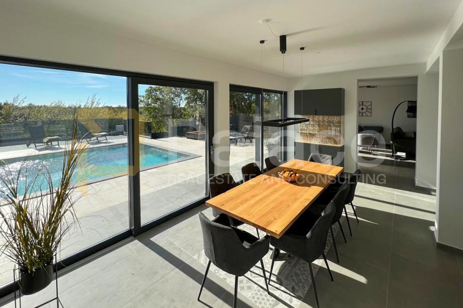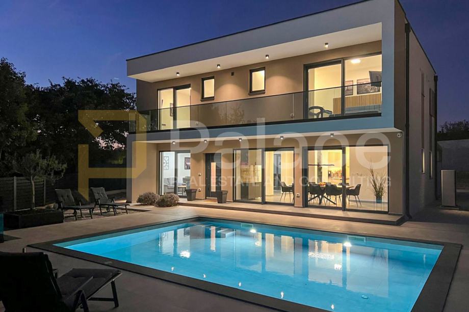 Unutrašnjost vile uključuje četiri prostrane spavaće sobe, svaka s vlastitom luksuznom kupaonicom, a dodatni WC na prizemlju osigurava praktičnost za sve posjetitelje. Ogromna terasa od 40 m² savršen je prostor za uživanje na svježem zraku, dok vanjski bazen dimenzija 7x5 metara omogućava opuštanje i uživanje tijekom cijele godine.