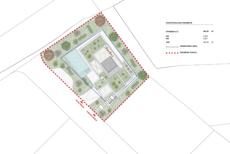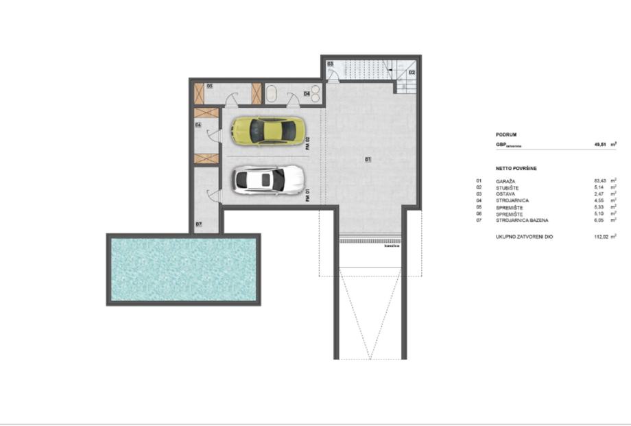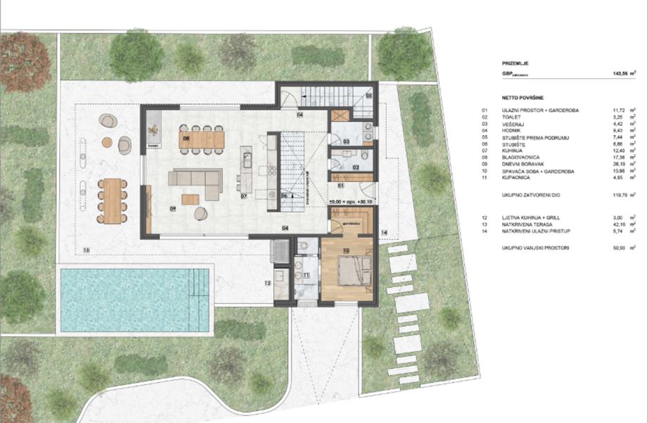 U podrumu se nalazi garaža za dva parkirna mjesta, ostava, strojarnica i dva spremišta. Prizemlje se sastoji od ulaznog prostora, toaleta, vešeraja i jedne spavaće sobe površine 15,96 m2 s vlastitom kupaonicom. Prostrani open-space dnevni boravak s kuhinjom i blagovaonicom ukupne površine 55,95 m2 je ispunjen prirodnim svjetlom te se iz istog pruža izlaz na vanjski dio gdje se nalazi bazen i sunčalište. Na istoj etaži se nalazi ljetna kuhinja i grill te veliki vanjski blagovaonski stol.