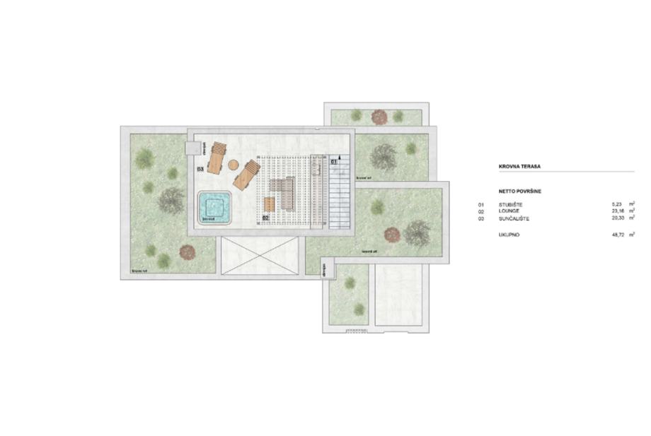 Stepenište vodi i na zadnju etažu, gdje se nalazi sunčalište i lounge zona. Na ovoj etaži predviđene su i vodovodne te elektro instalacije za ljetnu kuhinju i spa zonu, što budućem vlasniku ostavlja mogućnost potpune personalizacije prostora.