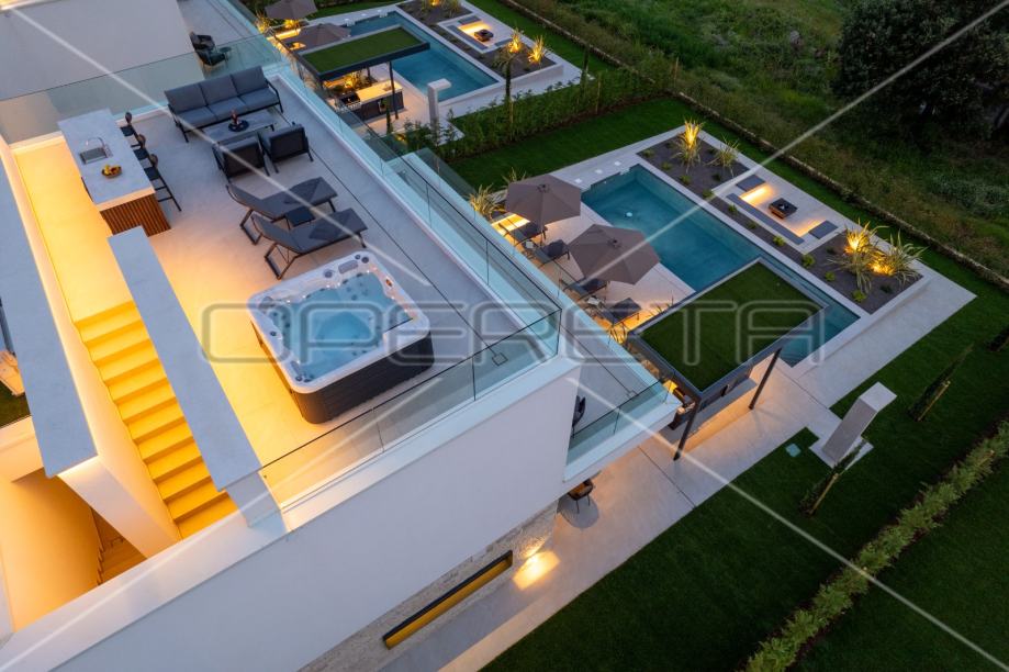 Eksterijer svake vile obogaćen je vanjskim grijanim bazenom, sunčalištem, natkrivenom terasom za objedovanje, nadstrešnicom s ljetnom kuhinjom i nenatkrivenom terasom neposredno uz bazen i vanjski tuš. U donjem dijelu dvorišta nalazi se fire-pit.