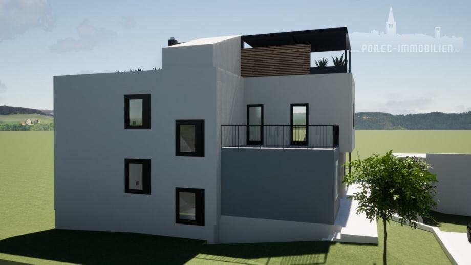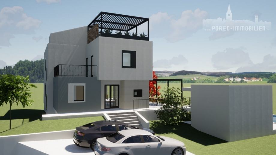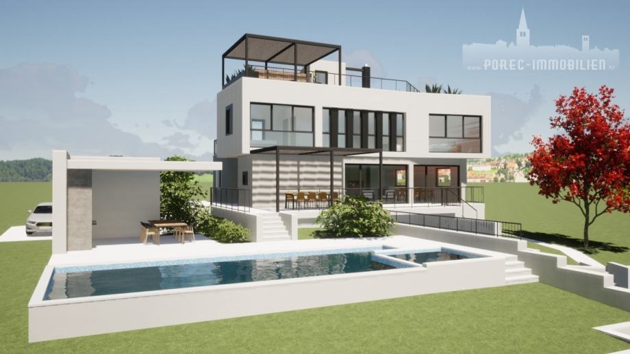 U malom turističkom mjestu u blizini Poreča, nalazi se ova prekrasna luksuzna vila suvremene arhitekture, sa pogledom na more i bujno zelenilo.