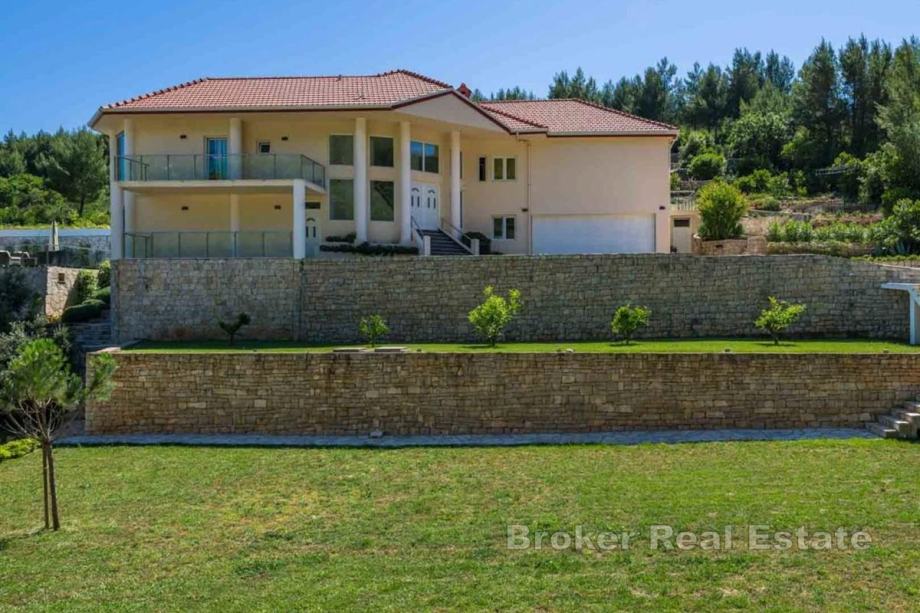 Okružena mirisnim borovima i maslinama, vila odiše spokojem i harmonijom. Prostrane terase s pogledom na more, vanjski lounge prostori i bazen površine 100 m² stvaraju idilično okruženje za opuštanje i uživanje u suncu tijekom cijelog dana, cijelog ljeta. Terasa od čak 500 m² idealna je za ljetne večere, privatne zabave ili jednostavno za uživanje u nezaboravnim zalascima sunca nad Jadranom.