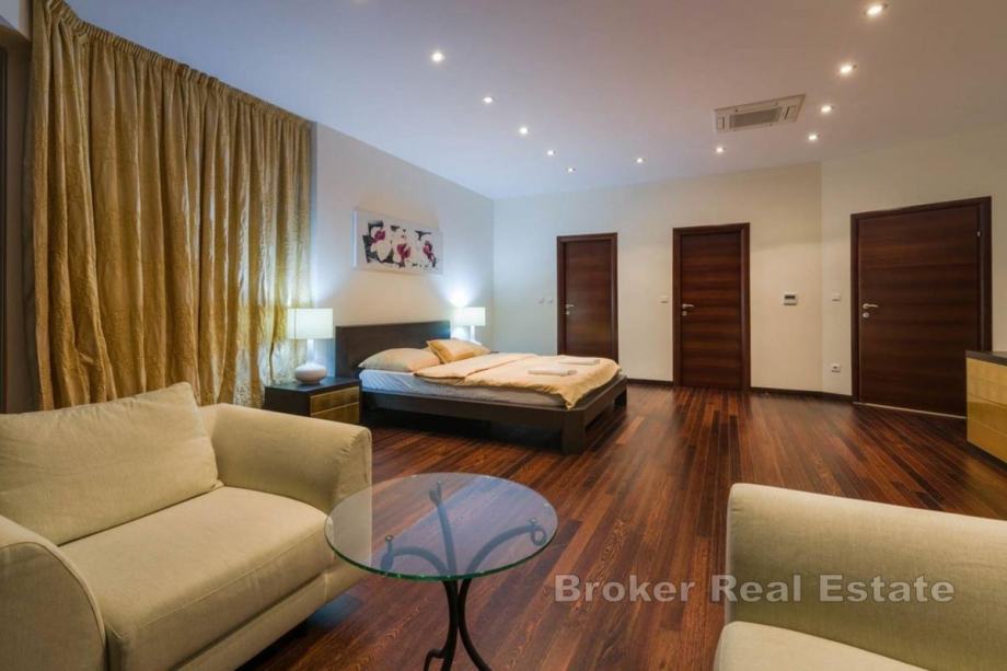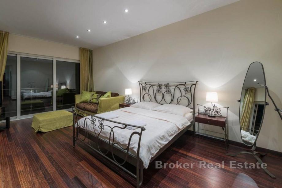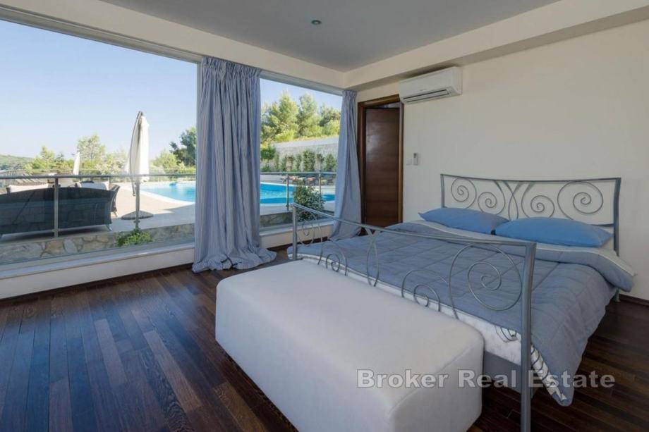 Na prvim katu su dvije luksuzne master spavaće sobe s panoramskim pogledom na more, elegantnim kupaonicama i walk-in ormarima, tri dodatne spavaće sobe, svaka s vlastitom kupaonicom, a sve kupaonice opremljene su podnim grijanjem za dodatnu udobnost.