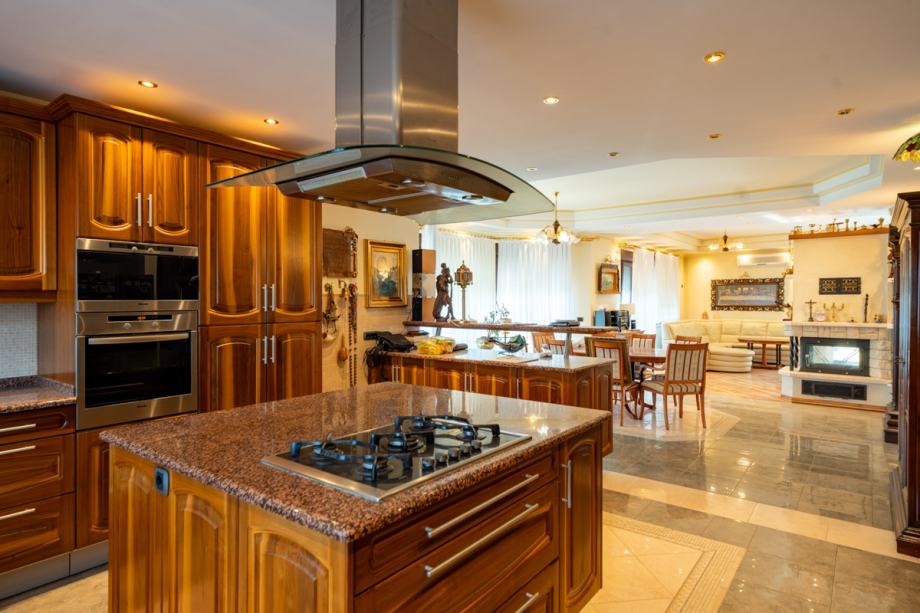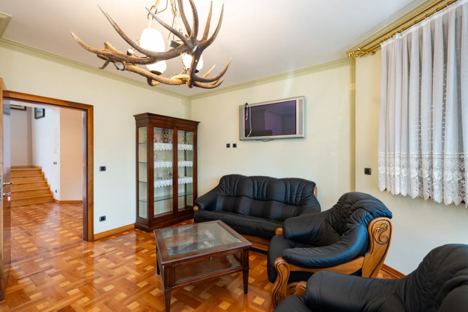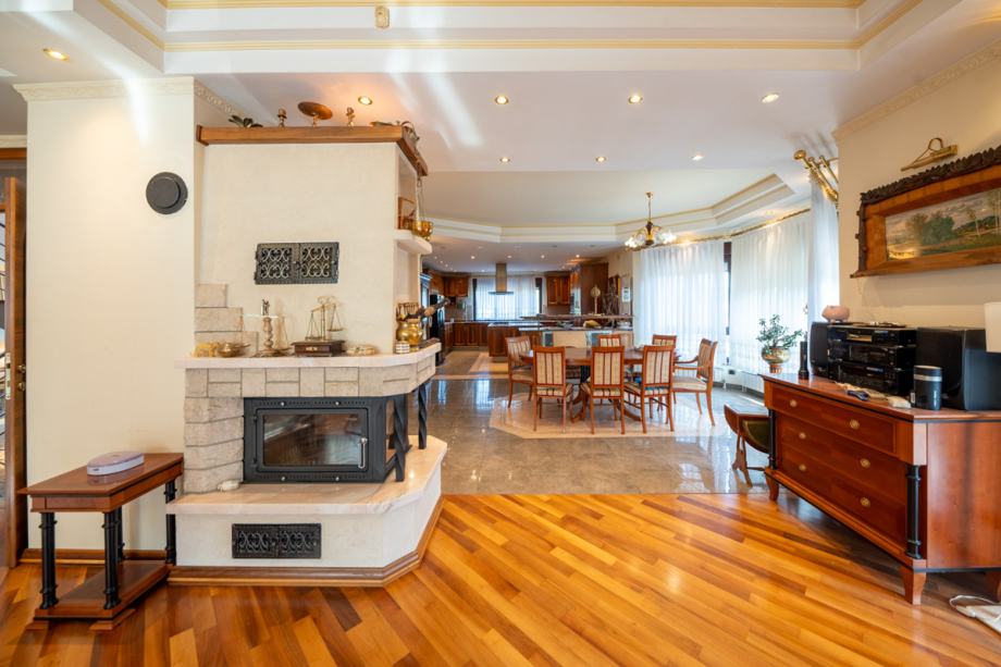 Open-space kuhinja, blagovaonica i dnevni boravak s kaminom koji pruža toplu i ugodnu atmosferu, idealnu za druženja i obiteljske trenutke, s izlazom na balkon. Tu je i radna soba, kupaonica te zimski vrt s nevjerojatnim pogledom na šumu.