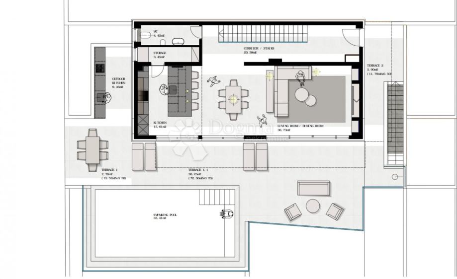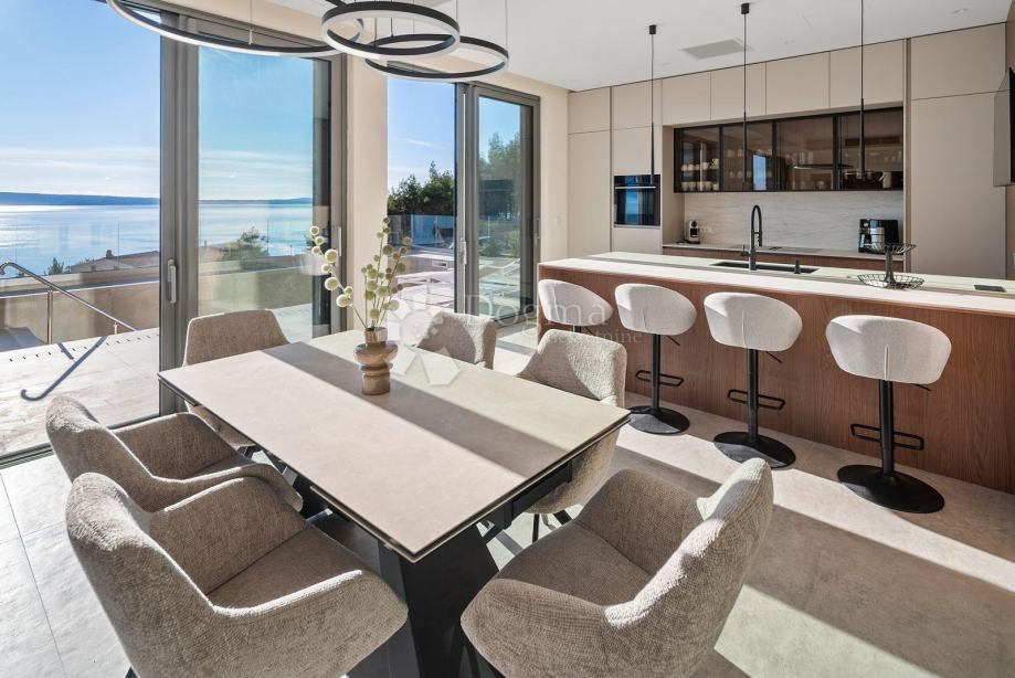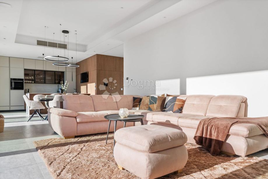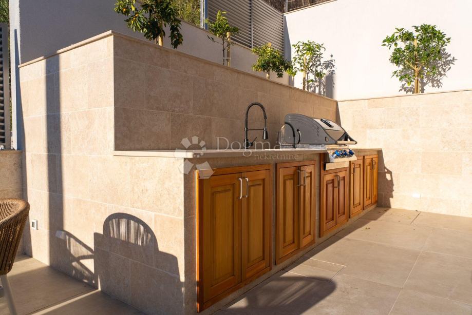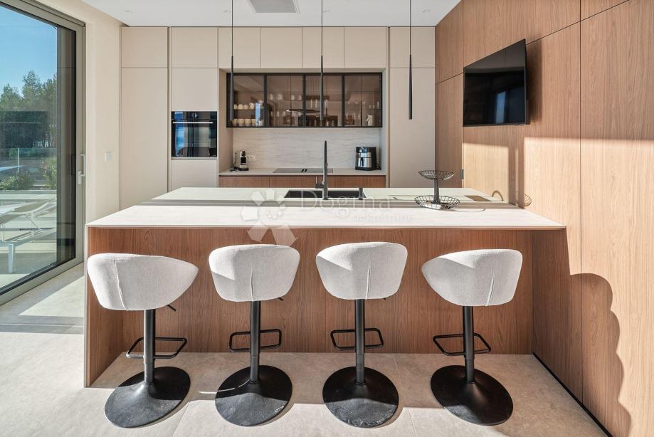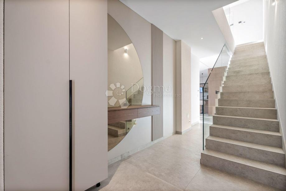 U prizemlju se nalazi prostrani open-space dnevni boravak, blagovaonica i kuhinja, obogaćeni gostinskim WC-om, stvarajući svijetao i reprezentativan prostor za obitelj i goste. Velike staklene stijene povezuju interijer s prostranom terasom, vanjskom kuhinjom, bazenom i sunčalištem – savršen prostor za opuštanje i uživanje u mediteranskom okruženju.