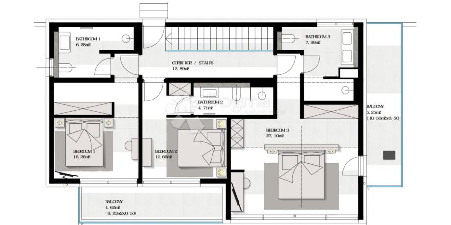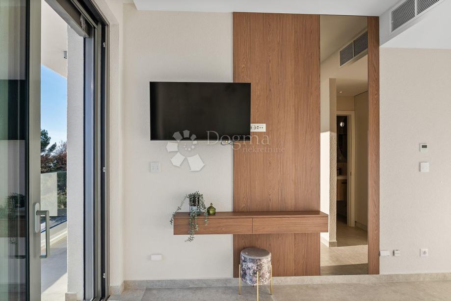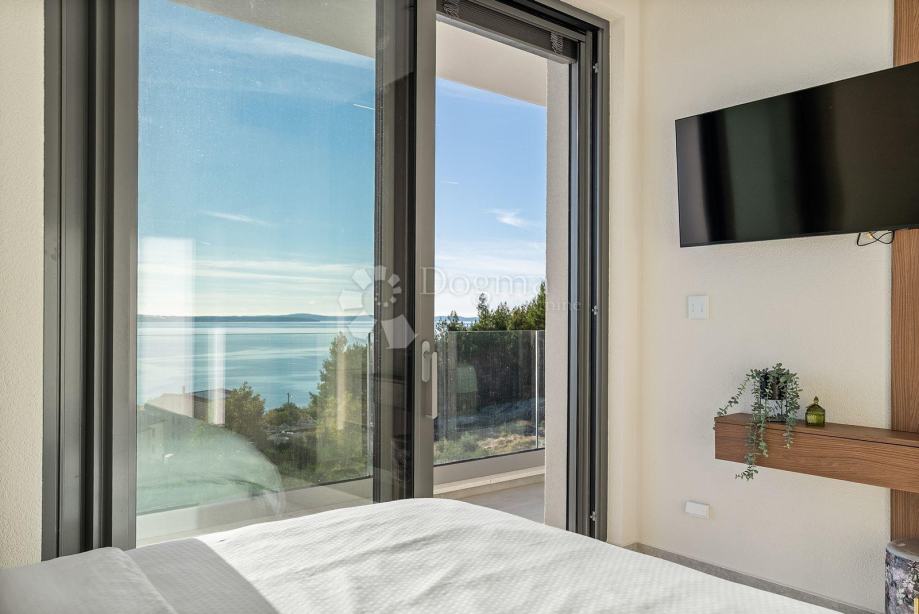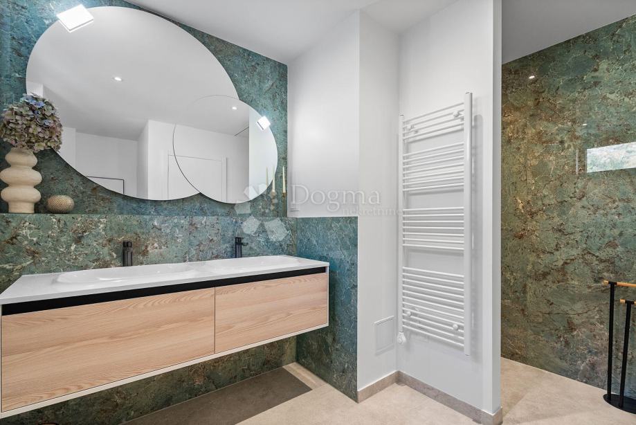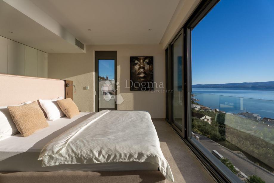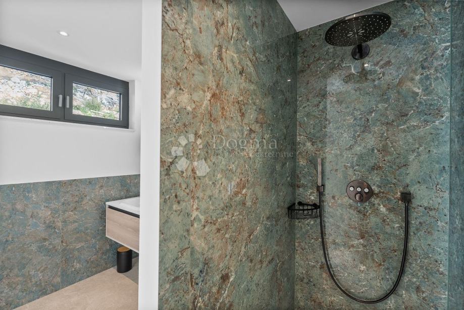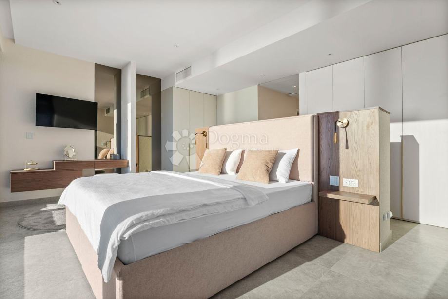 Na prvom katu nalaze se tri luksuzne spavaće sobe, svaka s en-suite kupaonicom i ugradbenim ormarima, s neometanim pogledom na more i otoke. Kupaonice su dovršene vrhunskim materijalima renomiranih proizvođača, s modernim dizajnerskim rješenjima i porculanskim pločicama (gres porculan) klase A.
