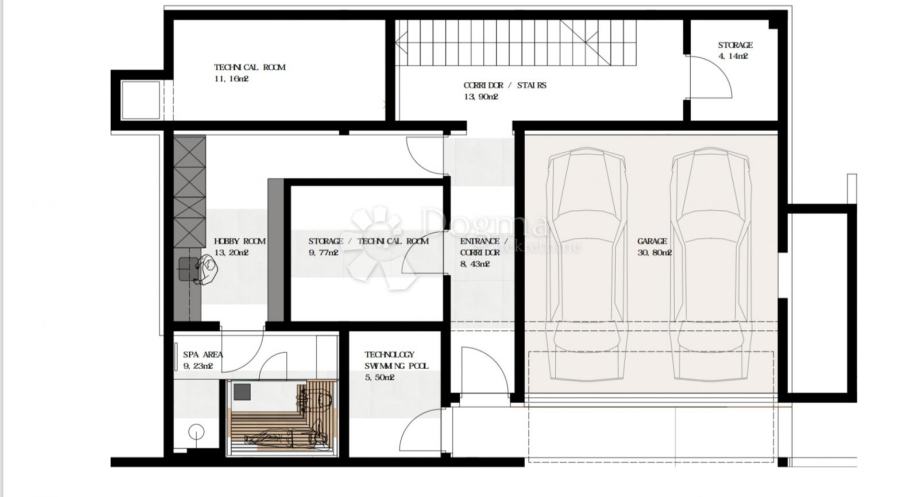 Suterenski prostor uključuje saunu, dodatni dnevni boravak, spremišta i tehničke prostorije, pružajući dodatnu fleksibilnost i udobnost. Vila također raspolaže duplom garažom i dvama vanjskim parkirnim mjestima.