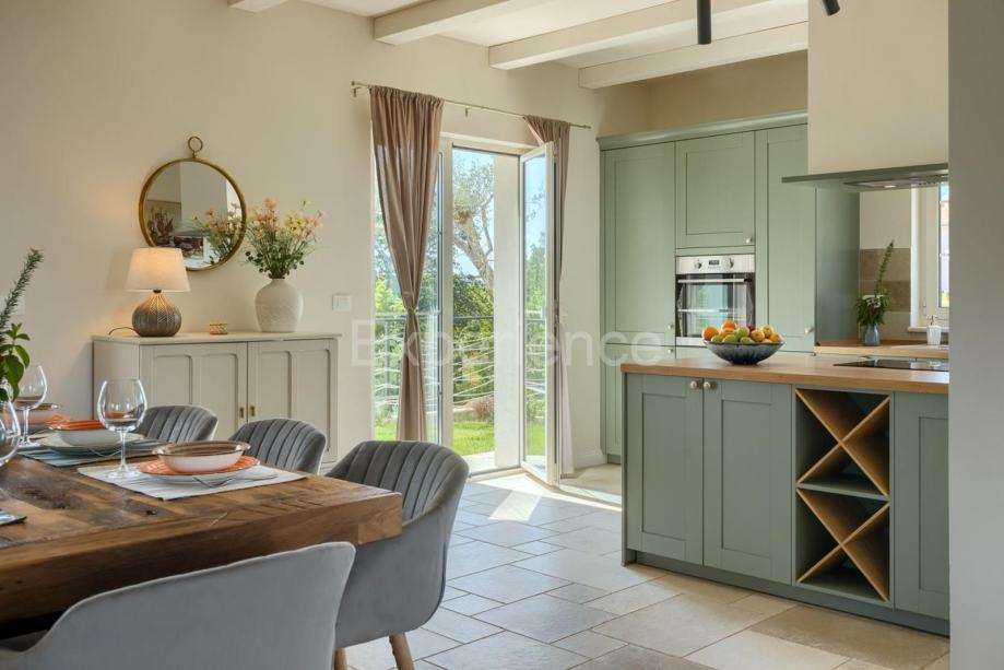 U mirnom i zelenilom okruženom istarskom selu, svega nekoliko kilometara od Poreča, smještena je ova ekskluzivna novogradnja s potpisom rustikalne elegancije i suvremene udobnosti. Vila površine 179 m², izgrađena 2021. godine, nalazi se na rubnom dijelu naselja i građevinske zone, što joj osigurava potpunu privatnost i široki panoramski pogled na netaknutu prirodu.