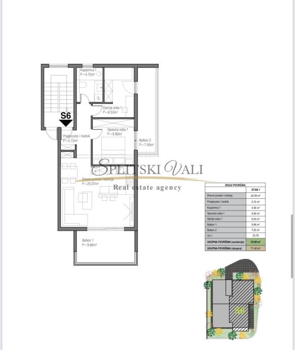 Ukupna površina unutrašnjeg prostora iznosi 53,8 + južni balkon 9,66 + istočni balkon 7,93. Ukupna površina iznosi 71,39 ( obračunski 62,5).