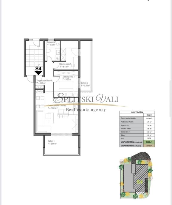 Ukupna površina unutrašnjeg prostora iznosi 53,8 + južni balkon 9,66 + istočni balkon 7,93. Ukupna površina iznosi 71,39 ( obračunski 62,5).