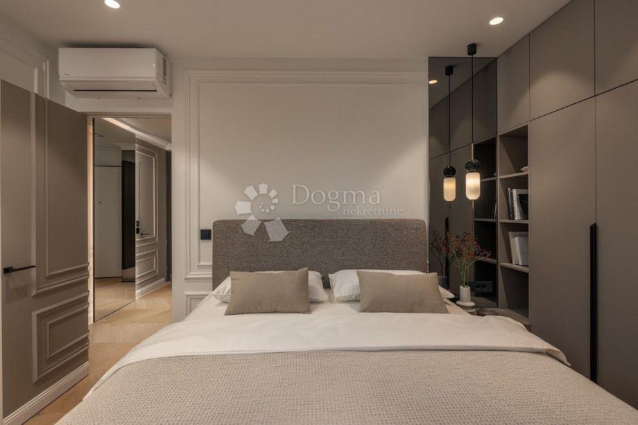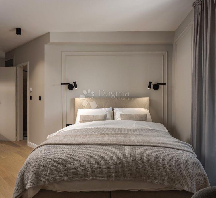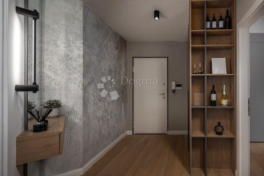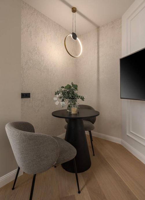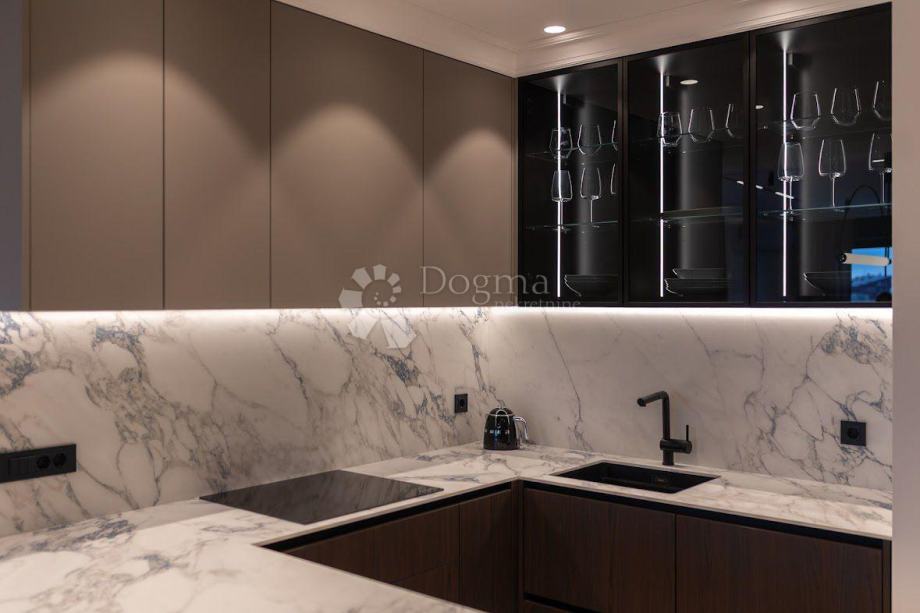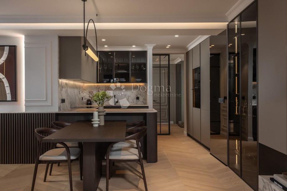Prostor je dizajnerski uređen i rađen po mjeri – svaki detalj, od rasvjete do podnih obloga, pažljivo je odabran kako bi se postigla savršena kombinacija elegancije, topline i suvremenog luksuza. Posebno se ističe elegantan bioetanol kamin koji stvara toplu i ugodnu atmosferu u cijelom stanu.