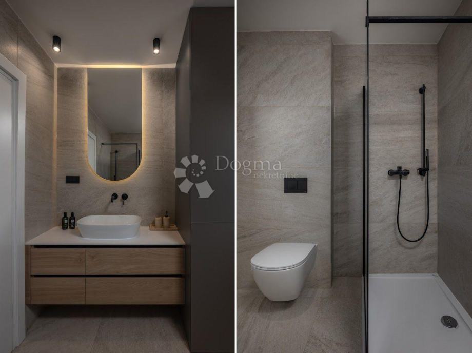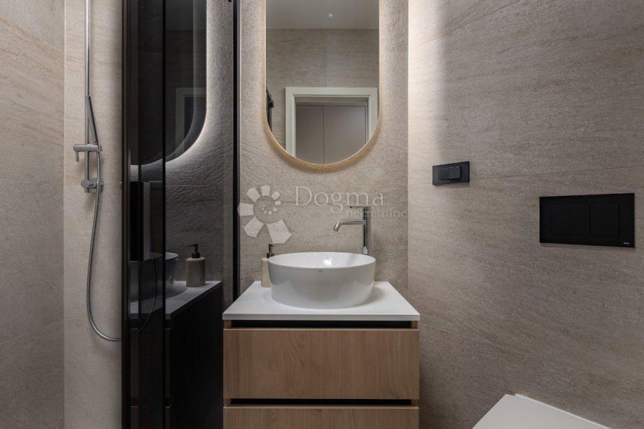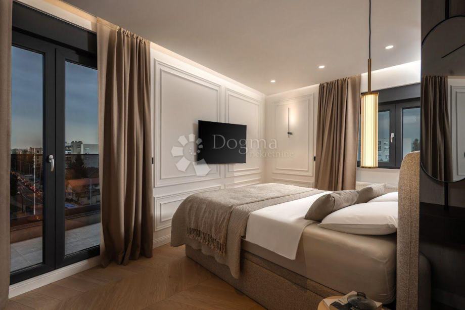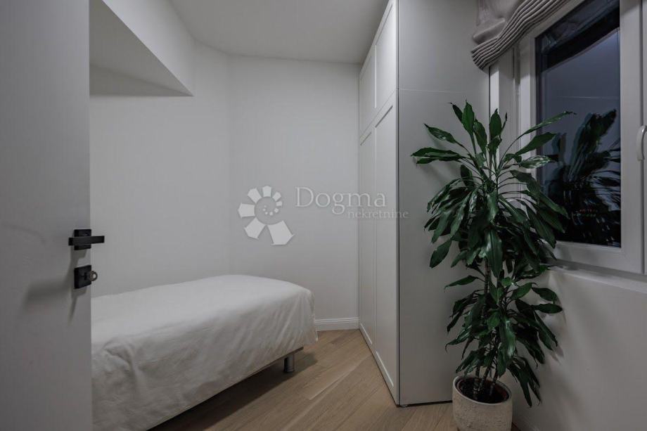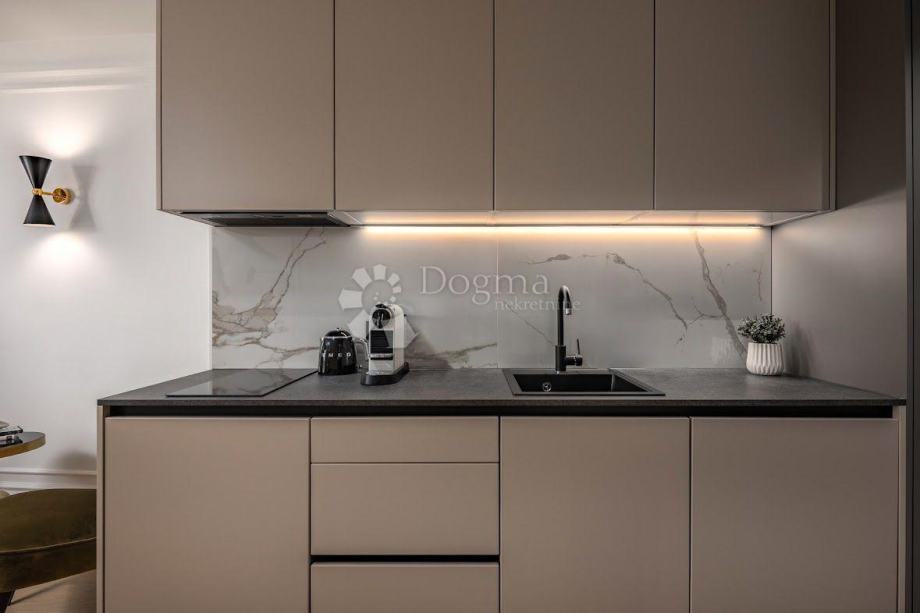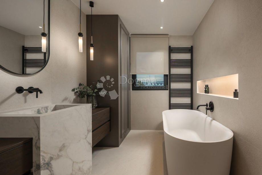 Prostor je dizajnerski uređen i rađen po mjeri – svaki detalj, od rasvjete do podnih obloga, pažljivo je odabran kako bi se postigla savršena kombinacija elegancije, topline i suvremenog luksuza. Posebno se ističe elegantan bioetanol kamin koji stvara toplu i ugodnu atmosferu u cijelom stanu.