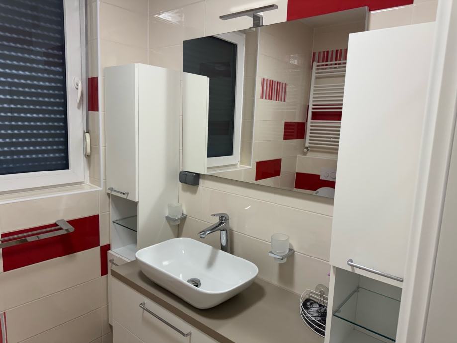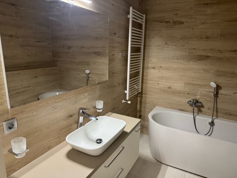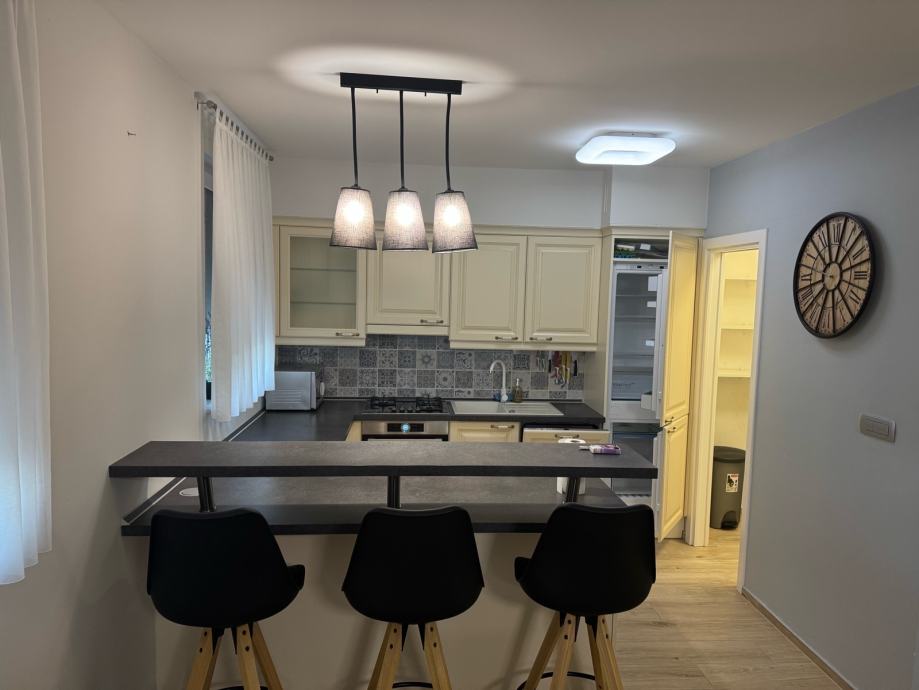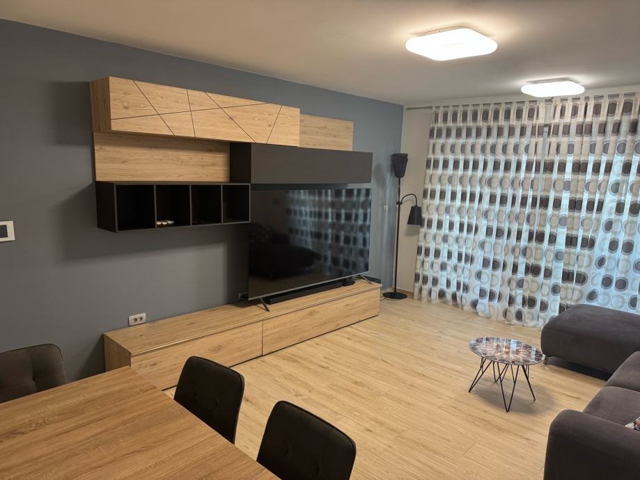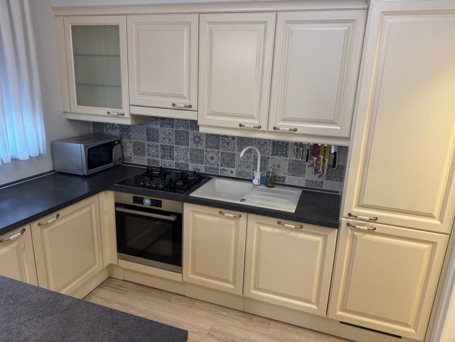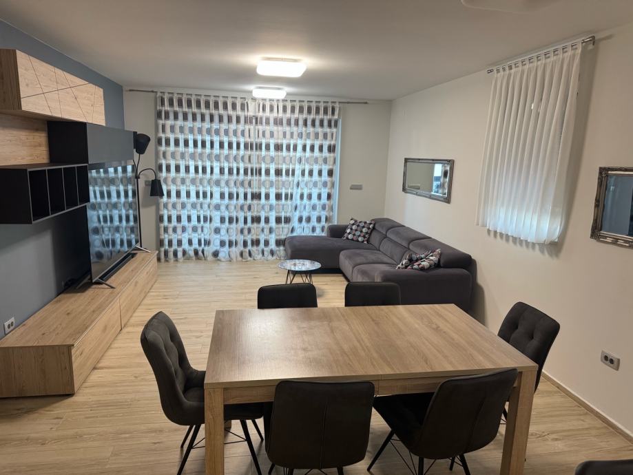 Komforan stan, 3 spavaće sobe, 2 kupaone, vrhunski opremljen i uređen. Uz stan ide i garaža za 2 auta. DanKuchen kuhinja, Bosch i Miele aparati, podno grijanje, vrhunska keramika i ostala oprema, video nadzor objekta…
