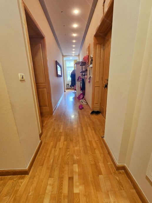Stan je renoviran djelomično 2025. godine. Novom betonskom dekom je osigurana statika i kvaliteta podova, novi krov na zgradi. Hodnik je prostran, obložen parketom koji se proteže kroz cijeli stan, bez pragova, a drvena stolarija daje prostoru topao, klasičan karakter. Raspored obuhvaća tri sobe, kupaonicu s WC-om i odvojeni WC, kuhinju s blagovaonicom i zimsku terasu što je praktično za svakodnevno korištenje. Raspored prostorija pogodan za pregradnju soba u slučaju potrebe za većim brojem spavaonica.