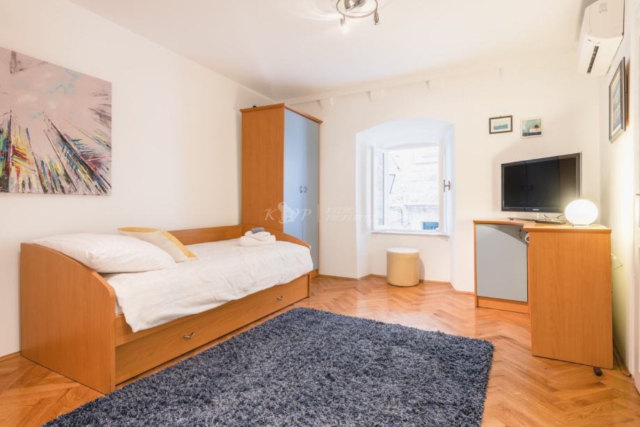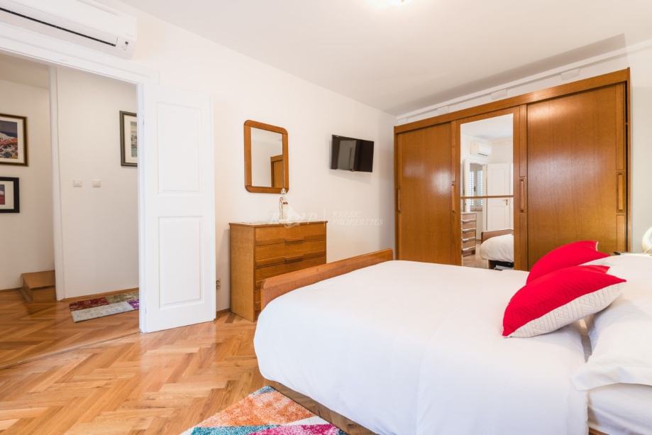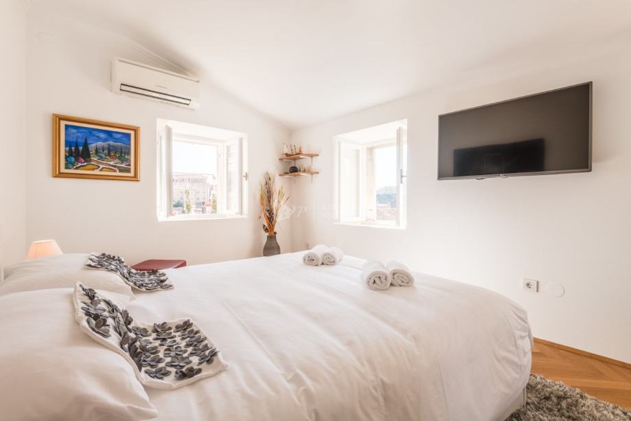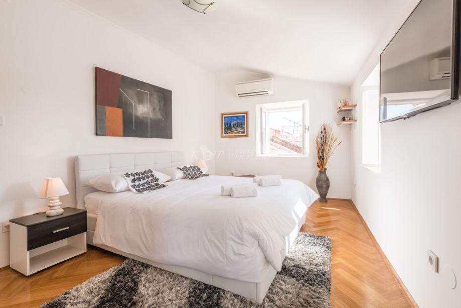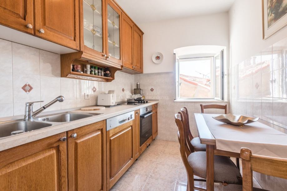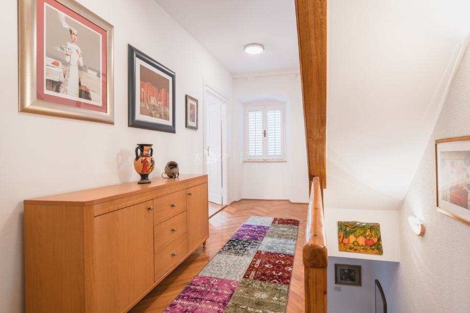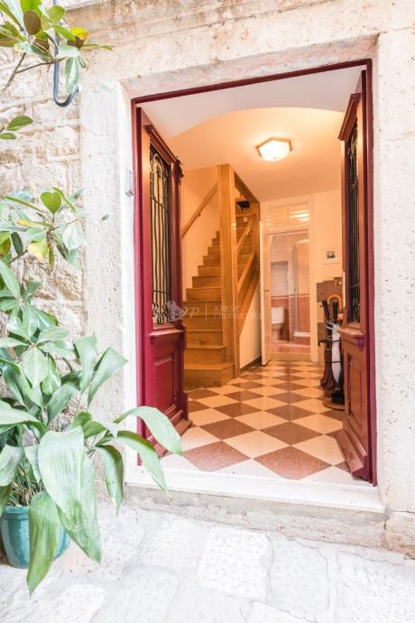 Kuća se nalazi u sporednoj ulici udaljenoj od buke i gužve na samo 60 metara od Straduna, najljepše ulice u gradu. Sastoji se od 5 etaža od čega svaka etaža ima 43 m2 neto površine, (215 m2 sveukupno). Etaža u suterenu ima odvojen ulaz i u njoj se nalazi velika prostorija i prostor gdje je davno prije bila gustijerna u kojoj su vlasnici planirali napraviti vinski podrum. Ovaj prostor se lako može prenamijeniti u poslovni što je dodatni plus nekretnini. U prizemlju kuće se nalazi hodnik i stubište, spavaća soba i kupaonica; na 1. katu hodnik i stubište, spavaća soba; na 2. katu hodnik i stubište, dnevni boravak s balkonom; a u potkrovlju se nalazi hodnik, spavaća soba, kupaonica i kuhinja.