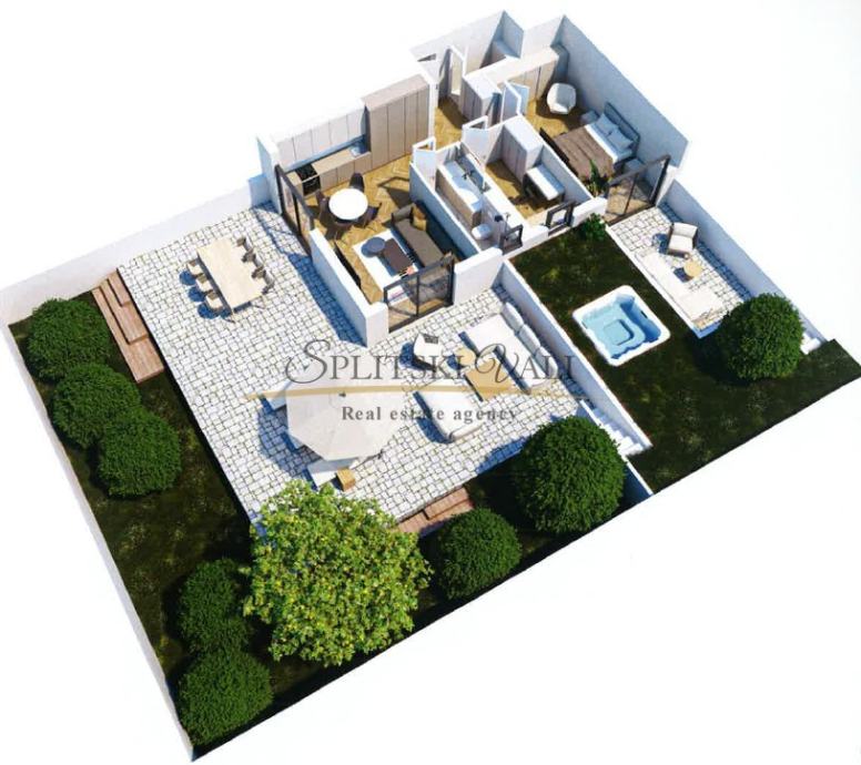 Sastoji se od hodnika, dnevnog prostora s kuhinjom i blagovaonicom, kupaonice, WCa, dvije spavaće sobe te prostranog vrta od preko 200m2, jacuzzi uključen u cijenu.