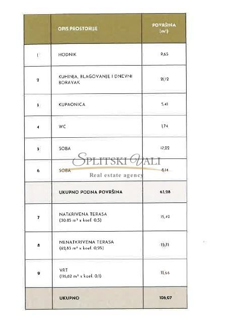 Stan 1 nalazi se na razini prizemlja te se prostire na 106.07m2 netto površine, 63.28m2 unutarnje površine.