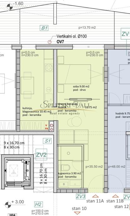 Stan 11A nalazi se na razini prvog kata te se prostire na 42,35 m2 netto površine, 35,5 m2 unutarnje površine.