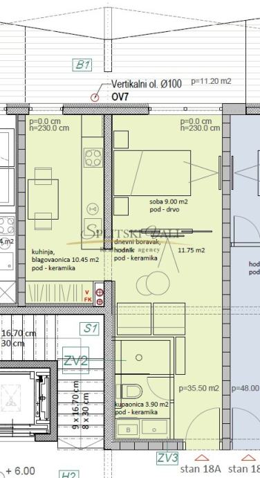 Stan 18A nalazi se na razini prvog kata te se prostire na 41.1m2 netto površine, 35.5m2 unutarnje površine.