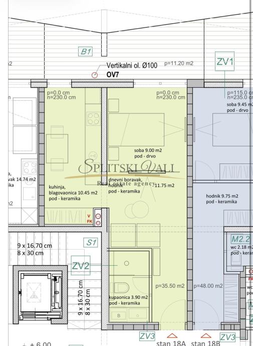 Stan 18A nalazi se na razini prvog kata te se prostire na 41,1 m2 netto površine, 35,5 m2 unutarnje površine.