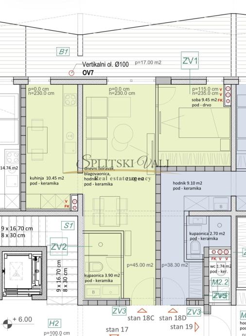 Stan 18C nalazi se na razini prvog kata te se prostire na 53,50 m2 netto površine, 45 m2 unutarnje površine.