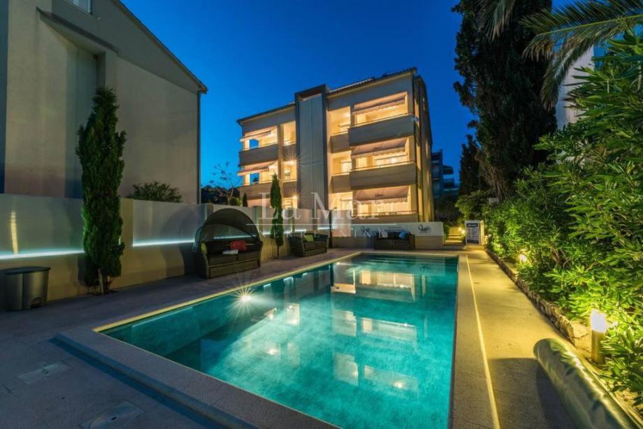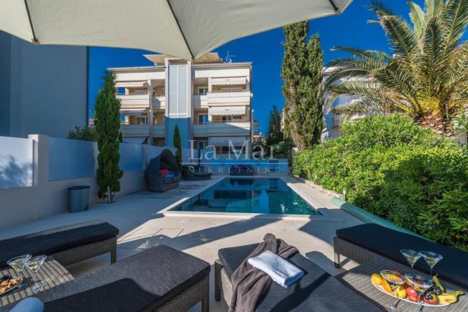 EKSKLUZIVNO! Adria La Mar nekretnine posreduje u prodaji 7 potpuno opremljenih apartmana u prekrasnoj Vili prvi red do mora sa bazenom koji pripada stanu u prizemlju.