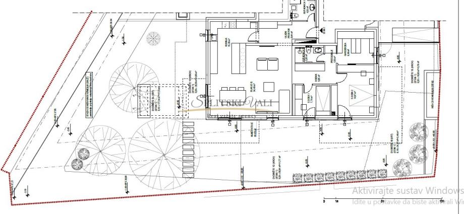 Sastoji se od hodnika, kuhinje, dnevne sobe s blagovaonicom, dvije kupaonice, dvije spavaće sobe, garderobe, natkrivene terase te prostranog dvorišta.