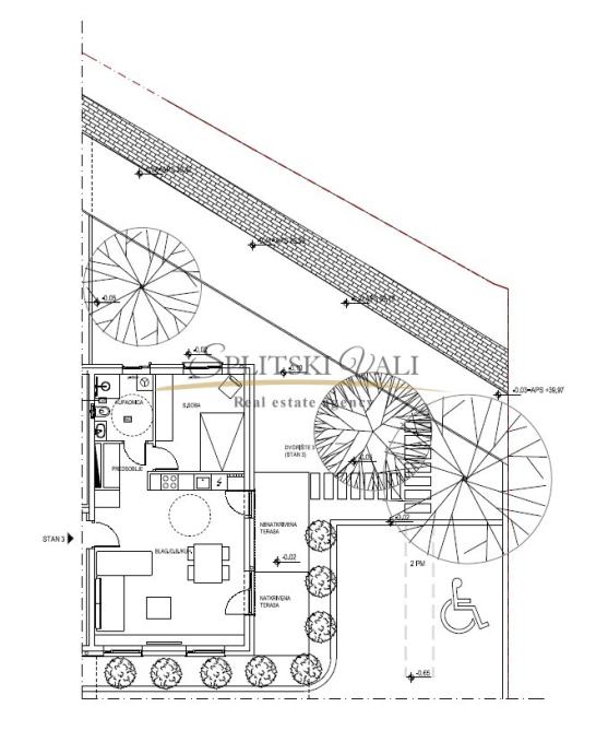 Sastoji se od predsoblja, dnevne sobe s blagovaonicom i kuhinjom, kupaonice, spavaće sobe, natkrivene i nenatkrivene terase te prostranog dvorišta koje se proteže na čak 114m2.