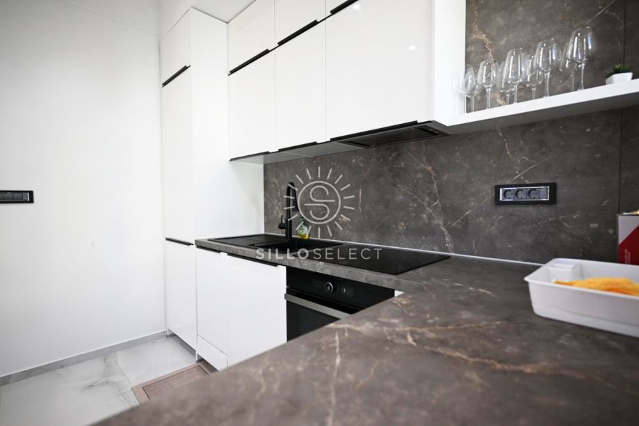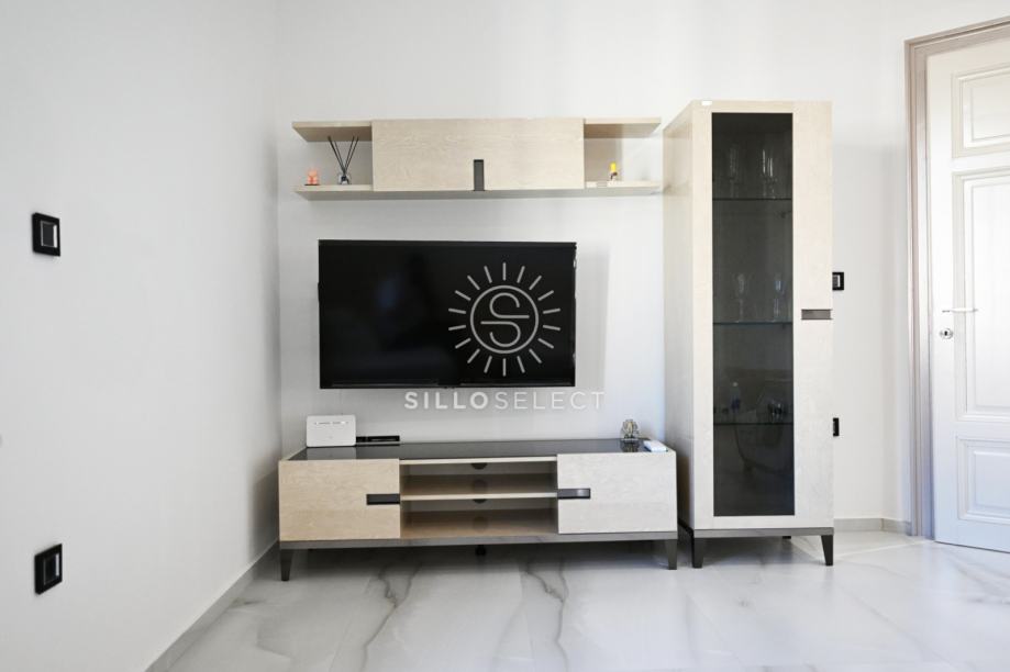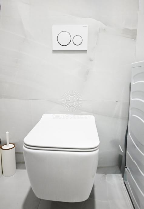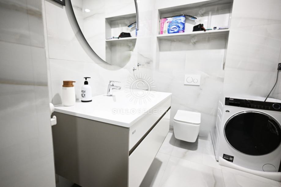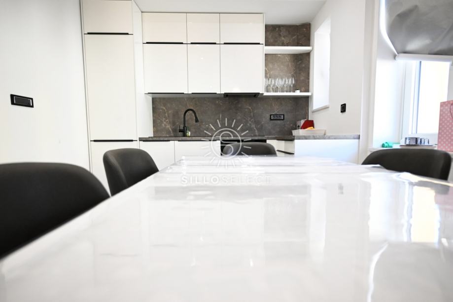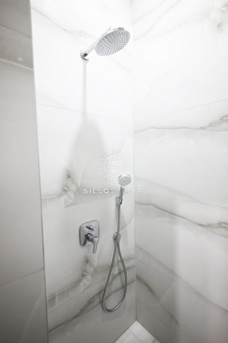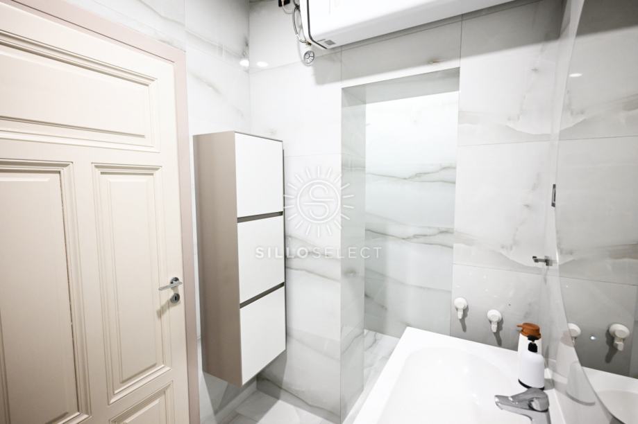 Stan ima 95 m² i sastoji se od dvije spavaće sobe s pogledom na more, dnevnog boravka, kuhinje s blagovaonicom te kupaonice. Prostor je svijetao, dobro organiziran i funkcionalan. Svaka prostorija ima klima-uređaj, a kroz cijeli stan provedeno je podno grijanje, što osigurava ugodnu temperaturu tijekom cijele godine.