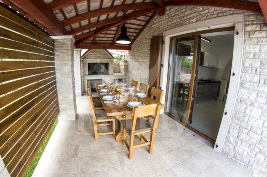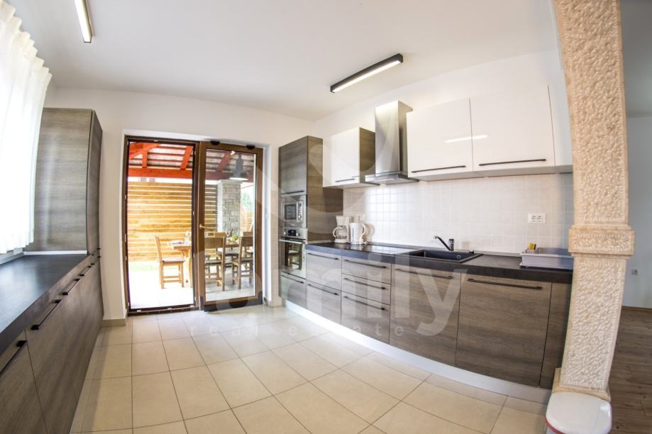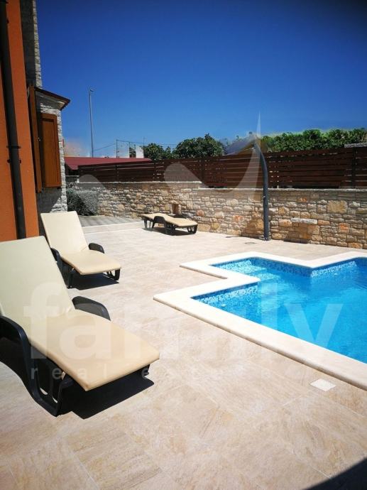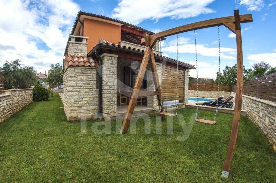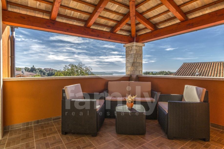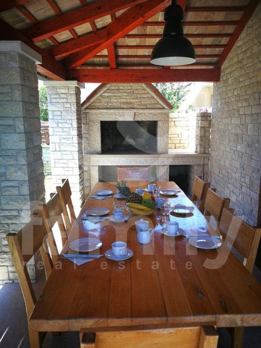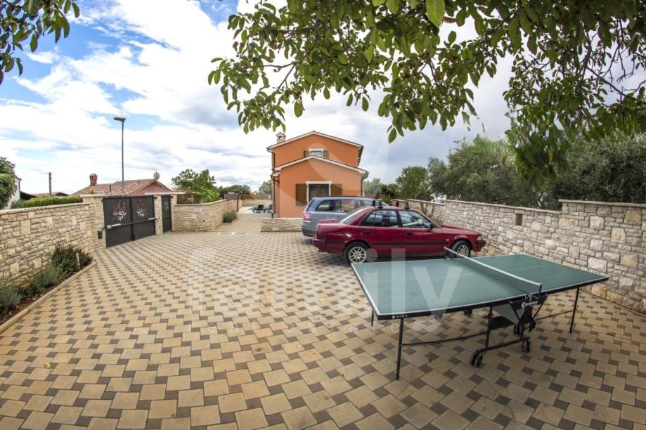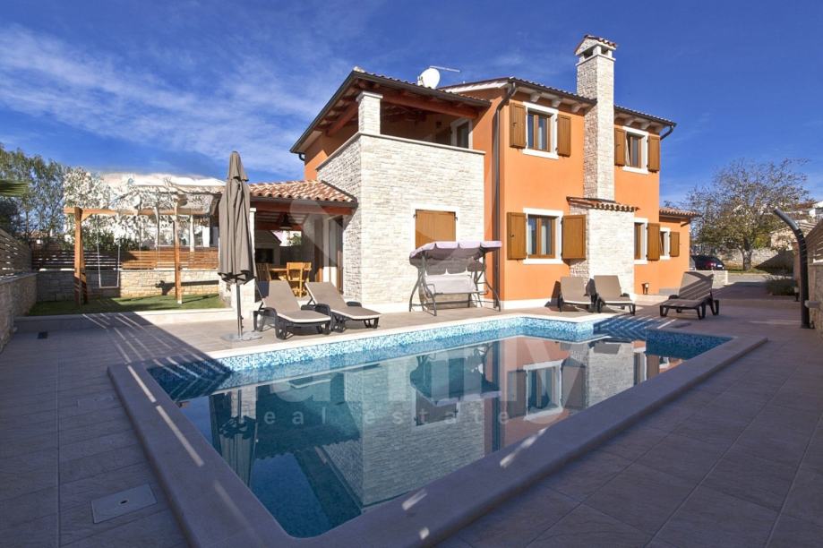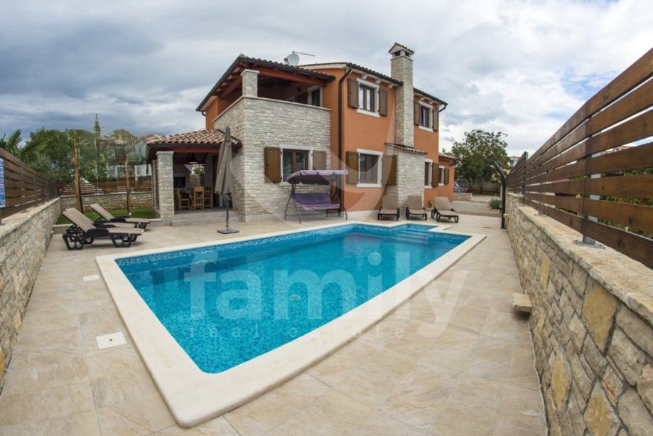 Nedaleko od centra Vodnjana i mora, u mirnom naselju zvanom Barbariga se smjestila navedena kvalitetna, obiteljska kuća sa stambenom površinom od 196 m2 i okućnicom od 460 m2. Kuća se proteže na dvije etaže, prizemlje gdje se nalazi ulazni predprostor, gostinjski toalet, prostrani i osvjetljeni dnevni boravak sa prostorom za ručavanje i kuhinjom kroz koju je omogućen izlazak na terasu popločanu kamenom i opremljenom vanjskim ugradbenim kaminom sa istarskom grotom i stolom za ručavanje za 6 osoba, kotlovnicom, bazenom sa sunčalištem kao i vanjskim tušem. Druga etaža odnosno prvi kat se sastoji od tri komforne spavaće sobe svaka sa svojom kupaonicom s tim da jedna spavaća soba posjeduje vlastiti balkon sa kojeg se pruža predivan pogled na more. Kuća je opremljena PVC stolarijom, podovi su obloženi kvalitetnim parketom kao i keramikom dok je sustav grijanja i hlađenja u cijelom objektu reguliran putem 4 jedinice klima uređaja. Nekretnina je također opremljena solarnim grijanjem koje osigurava toplu vodu za bojler obujma 500 L. Parkirna mjesta su osigurana nadstrešnicom s dva natkrivena parkirna mjesta, dok su dodatna dva parkirna mjesta dostupna na nenatkrivenom dijelu.