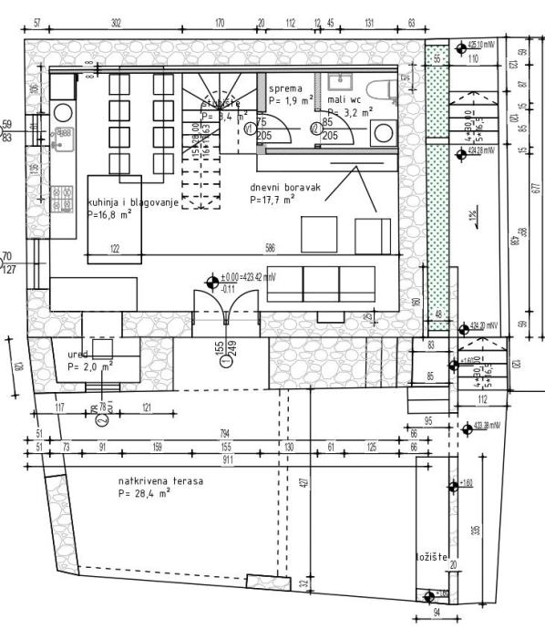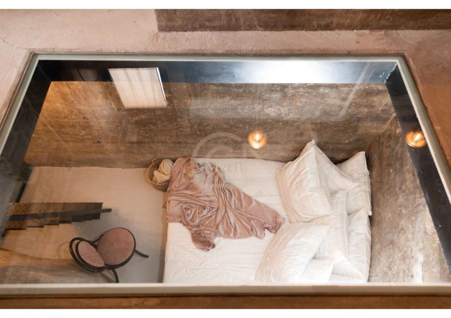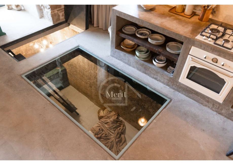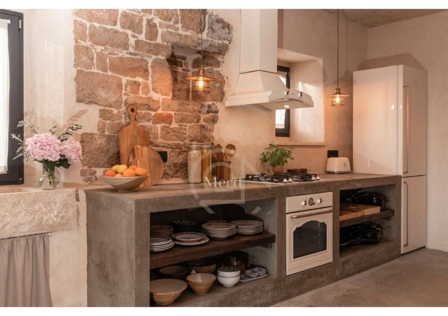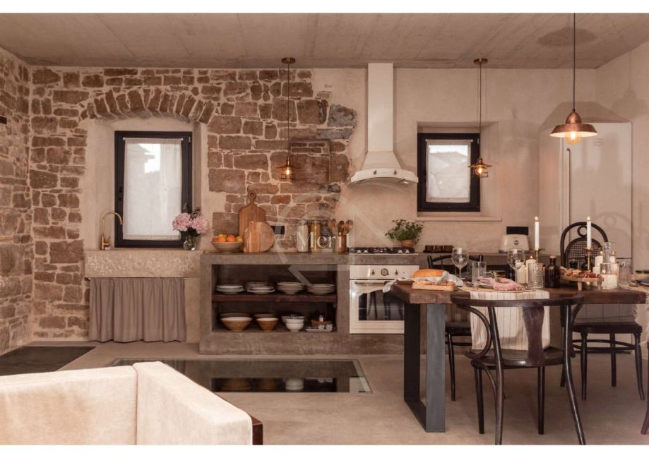 U prizemlju, gdje su nekada bila skladišta maslinovog ulja i vina, a kasnije i kovačnica, sada se nalazi moderna kuhinja, dnevni boravak, sprema, WC te coffee & wine bar. Kuhinja od betona savršeno se uklapa u rustikalni ambijent, a kauč u boravku stvoren je da savršeno pristaje uz stare kamene zidove, stvarajući eklektičnu harmoniju starog i novog.