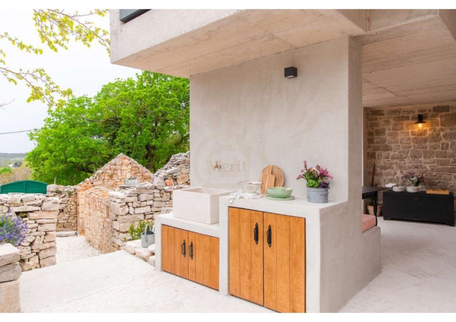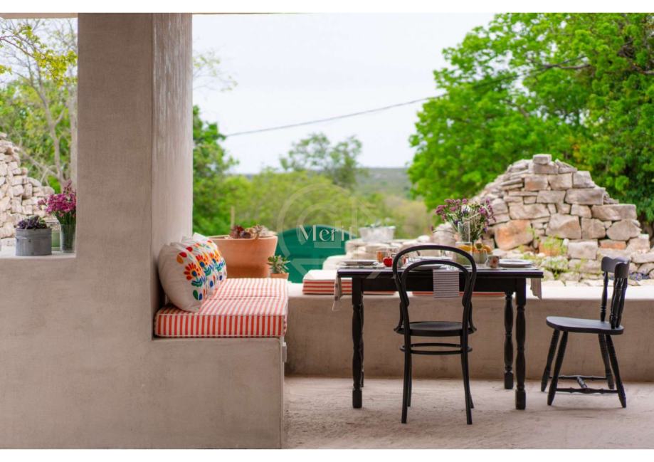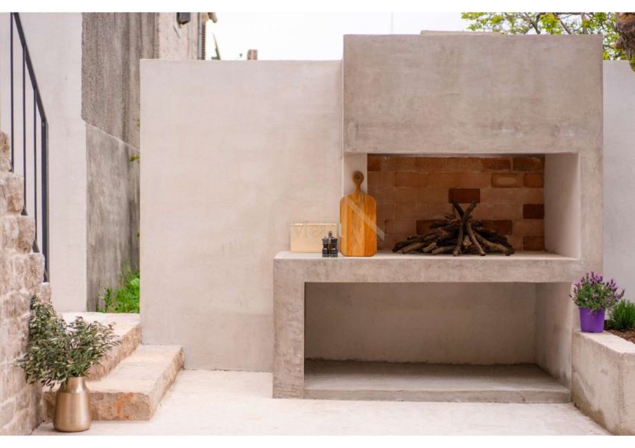 Intimno dvorište na zapadnoj strani kuće poziva na uživanje, s kaminom, vanjskom kuhinjom i prostorom za druženja, a stepenice vode prema obnovljenim stari mirinama – savršenom mjestu za meditaciju, vježbanje i uživanje u tišini.