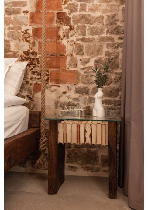 Svaki detalj ove kuće pažljivo je biran – od fotelje do stola u boravku, koji je donesen iz obližnjeg kamenoloma. Čak je i stol u blagovaonici izrađen od starih gredi, koje su sačuvane iz same renovacije. U istom duhu, lebdeći krevet u ženskoj sobi stvoren je od istih gredi, a prostor je ispunjen unikatnim komadima namještaja koji pričaju vlastitu priču.